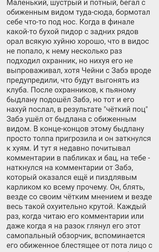 >>97547 Рассказывал. Я несколько тредов назад итт скриншот описания выступления инцеста скидывал. У него только 1 раунд был вменяемый. Остальные 2 всрато пел, что публике вообще не заходило. Цифры сделал статичный бпм, просел в комплиментарном, а так всецело был лучше Вахи (и это ещё по мнение диподсова, значит инцест обосрался куда сильнее). Даже черт в конце сказал: Это не то, что мы ждали. Нахуй такие биты (распевочные)