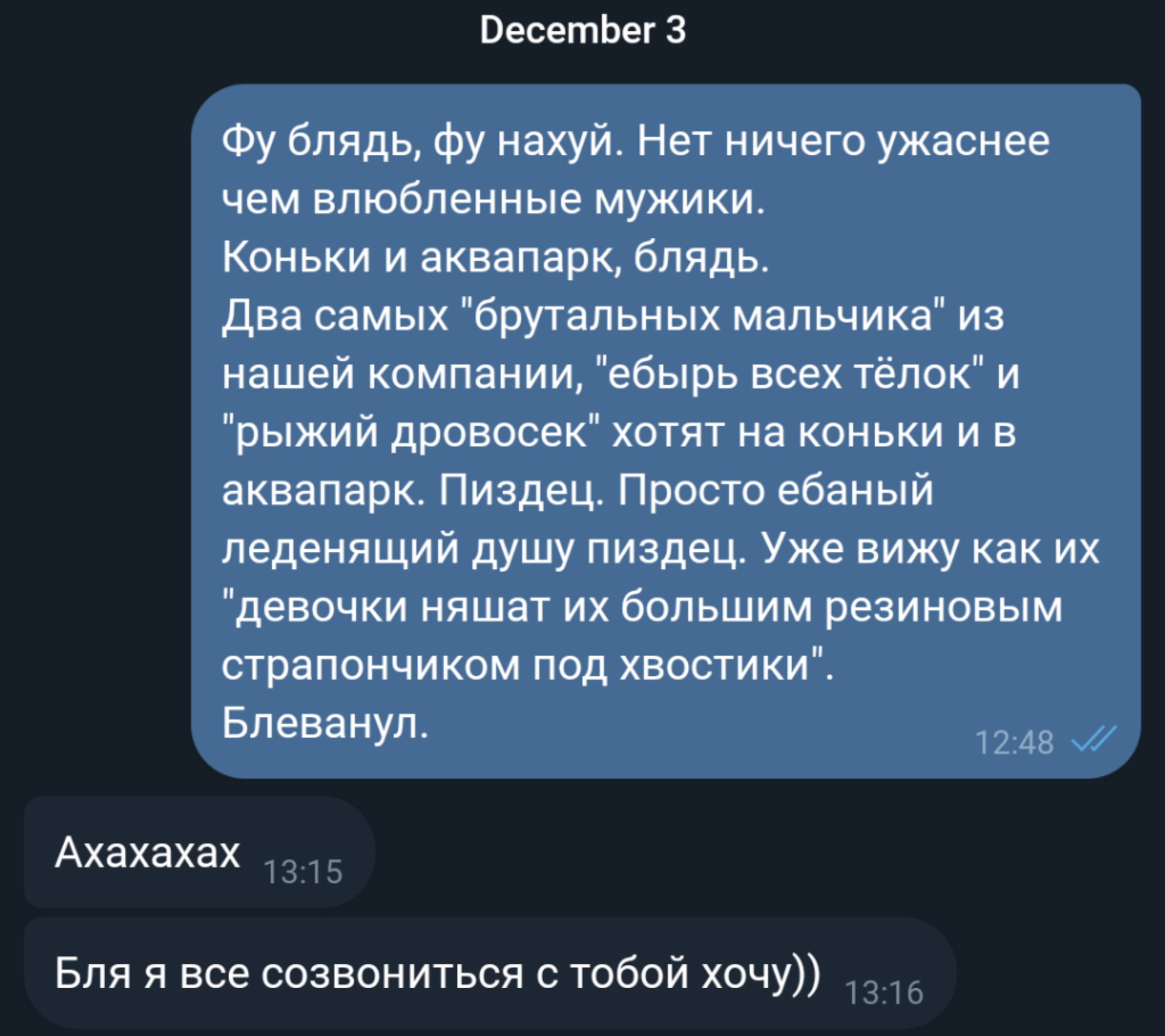 Антонче умудренный опытом, я пришел к тебе с таким вот тезисом. И я действительно так считаю. Расскажу сейчас о чем речь: в общем существует компания в 6 человек, в том числе и я, все мужского пола, всем по 27-28 лет. Общаемся уже больше 12 лет. Так вот, двое из этой компании нашли себе девушек и превратились в какое-то говно. Нет, у них и раньше были девушки. И у всех остальных были и есть девушки, да и я сам нахожусь в отношениях, и строю квартиру со своей, и все серьезно, и бла бла бла. Все было отлично в компании, никаких соплей и ТД. Но они умудрились найти себе таких, которые загнали их под свой каблук, а они рады и просят добавки. На это дерьмо противно смотреть. Хвосты ебучие: девка пошла покурить, он за ней. Девка села, он сел. Девка встала, он встал. Они завели новые аккаунты в соц. сетях, где подписались так же, как их бабы. Они пишут под фотками признания в любви, они перешли уменьшительно-ласкательные во всем. У них везде "Мы". Полное отсутствие личности, отсутствие мнения, отсутствие мужика, блядь. И именно эти двое всегда были "самыми брутальными". Один мол переебал хуеву тучу тёлок и вообще. А второй высокий, статный, с бородой, такой весь викинг, блядь. Об них ноги вытирают, я даже 10% всего блядства не расписал, а они и рады. Как с этим говном бороться? И есть ли смысл бороться? Потому что я на это смотреть больше не могу и мне правда противно до тошноты. После последних посиделок я просто не хочу в этот оплот розовых соплей возвращаться. Где моя компания? Где веселая компания? Где жизнь? Где треш? Где охуительные истории и пиздатые вечера? Где мои поездки на сноуборд, лыжи, походы поиграть в большой теннис, попрыгать в озеро, блядь, с тарзанки, покататься на водных мотоциклах, съебы с палатками в лес и ТД.? Где походы в бары, где знакомство с тёлками, где трешевые истории с наших сборищ? Где мужики? Что с ними?