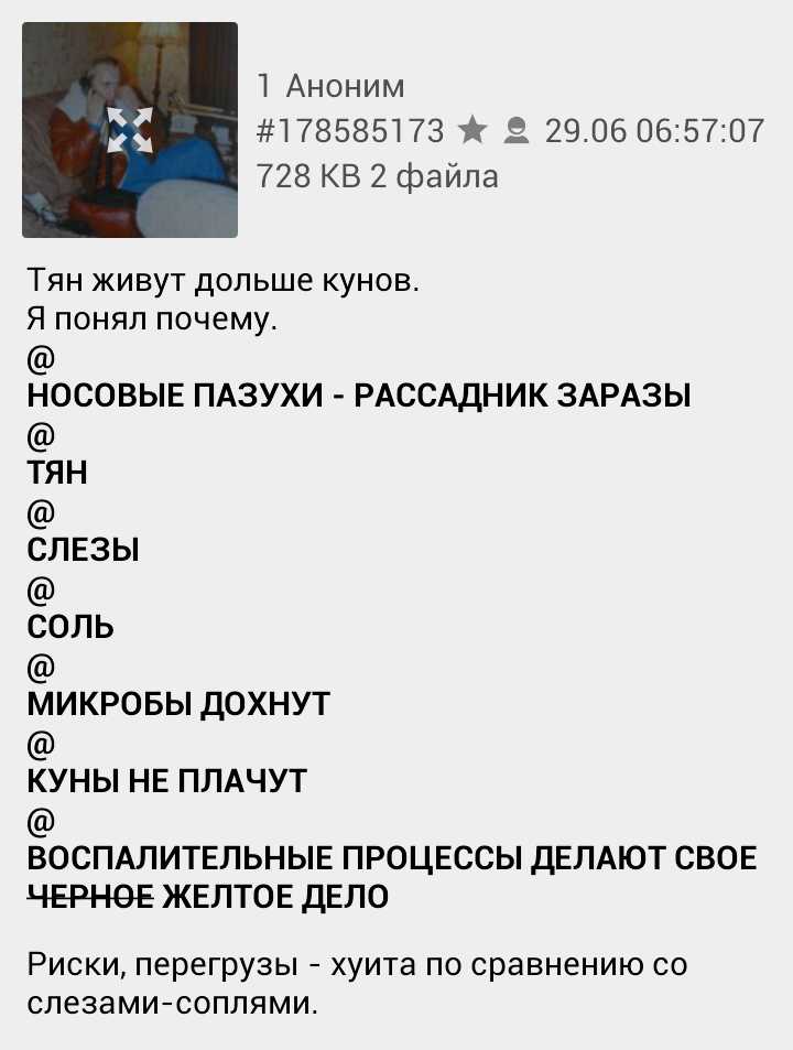 >>61662 >Не пиши свой дешевый маленький троллинг с маленькой буквы. Это как раз такие как ты - бояться смерти, до уссачки, до такой степени что им срать на всех и вся, лишь бы не помереть, лишь бы погнить еще один день. >Искренне желаю тебе рака пищевода. Так и представляю, как ты будешь гноем срать и при этом считать, что сдохнуть - это страшнее. и ты думаешь тебя хоть кто-то воспримет всерьез после таких пожеланий? тебе сколько, лет 15?