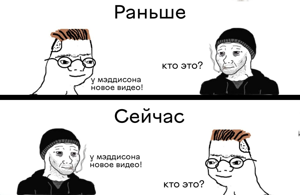 Когда маленьким был, смотрел Мэддисона и играл в мморпг, и не ебешь кто такой ивангай и влад бумага, ты же не конча. А потом осознаешь что те "фэндомы" мэддисона это школьники которые косят под олдфагов, а еще вчера смотрели ивангая и бумаг. Недавно видел школьников которые сделали картинку мол "спасибо влад бумага за детство" ну охуеть теперь.