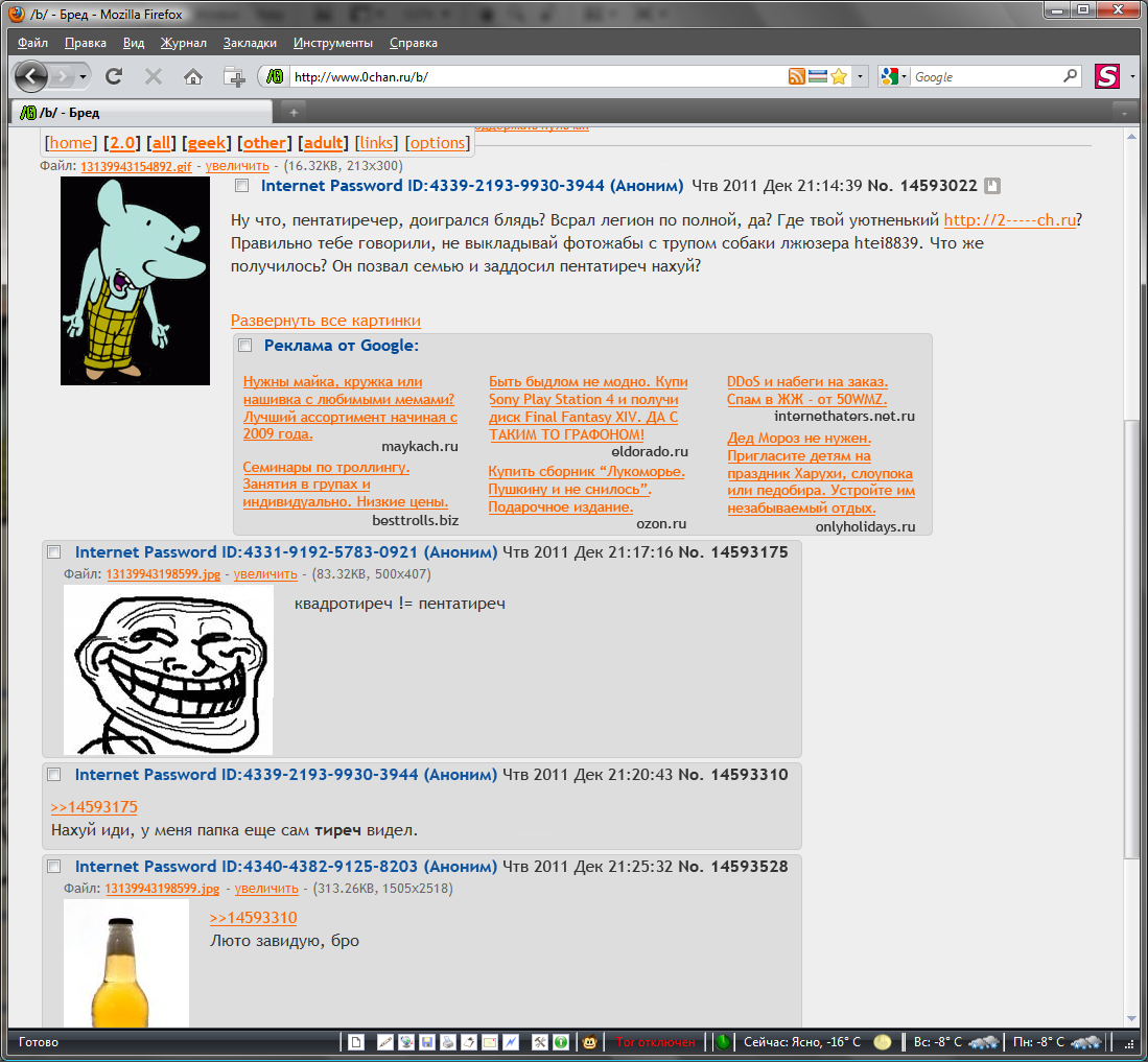 Активно сидел где-то с 2009 по 2011 включительно (т.е. много читал треды, писал, общался с анонами). Сейчас даже почитать нечего.