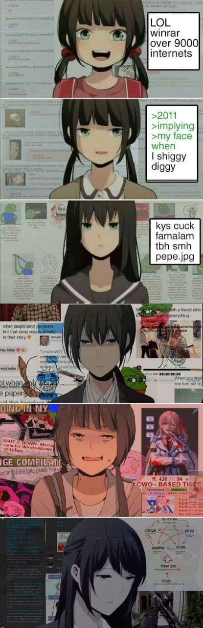 На Два.ч я зашел поздно, и не успел застать то время когда тут сидели япофаны, о старом дваче слогали легенды, сейчас на /b творится хаос, любой школьник может выложить тред о его невьебических приключениях с 3D тян. Это ломает двач.