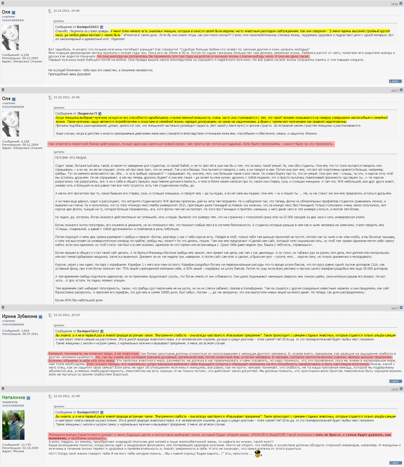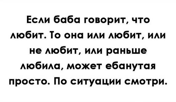 >>67021 (OP) Женись на молодой, но не тупой. Не женись на истеричках. Если баба закатывает истерику или бьётся в слезах из-за сломанного ногтя или того, что ей не нравится, во что ты одет - идёт на хуй. Если у неё куча друзей и она очень много времени проводит в телефоне, переписываясь с ними - ну ты понел... Ты для неё источник каких-то ресурсов (уважение, деньги, забота), но не мужчина её мечты. Если есть проблемы со здоровьем - дальше будет только хуже. Конечно, ты можешь блаародно жениться на инвалиде, только вот через довольно короткое время будешь посматривать на нормальных девушек и тяготиться своей. Не женись на бабе, которая не считается с твоим мнением. Сам допустил эту ошибку, теперь хочу предостеречь тебя. Делал слишком много уступок, многое прощал или игнорировал, баловал, часто шёл на компромисс. Дошло до того, что она окончательно охуела и поняла, что ведёт себя неправильно, только когда я собрал вещи и уехал от неё в Москву. Думаю, многие женщины ноют для того, чтобы склонить мужика к нужному им варианту развития событий, но уважают они только тех, кто игнорирует эти попытки и делает так, как считает нужным. Парадокс? Попробуй сам. Не женись на той, у которой проблемые родители: наркоманы, алко- и кредитоголики, сидевшие и т. д. После женитьбы их проблемы станут проблемами семьи, а значит и твоими тоже.