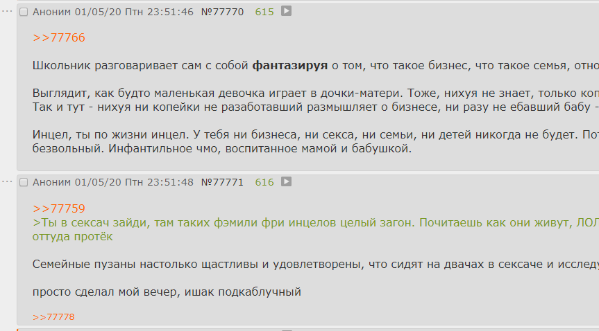 >У инцела Инцел здесь ты сам, чудила, потому что у тебя нет тян, дурачок, смекаешь? Перечитай предыдущие посты. Можешь ты взять и пойти познакомиться с тянкой? Нет. Потому что ты всё просрал, пидораха, у тебя теперь только свиноматка-овуляха, которую надо обслуживать.
