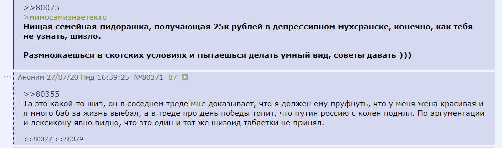 > НЕ БОМБИТ Визги дегенерата, ЛОЛ, у меня свежие тяночки, лето, а ты гниёшь в хрущёвке с овуляхой на нищенскую зарплату, и бомбишь конкретно, пидорашка семейная, инцелодебил.
