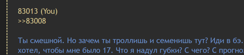 Ты смешной. Но зачем ты троллишь и семенишь тут? Иди в бэ. Ты пытался обидеть меня тем, что мне 17? Бля, я бы очень хотел, чтобы мне было 17. Что я надул губки? С чего? С прогноза, что я хлебну горя? Ну а у тебя сегодня мать сдохнет. Обидно? Думаю, что нет. Вот и мне не обидно. Это одно и тоже. С тем же успехом он мог прочесть один мой пост на дваче и сказать "завтра ты найдешь любовь всей своей жинзни" или еще какую-то чушь. Я первое что написал? Что могу только от себя рассказать ситуацию, но опу что-то советовать не берусь. Это отличает взрослого человека от двачера. Двачер сразу всем все посоветует, поставит диагнозы и сделает прогнозы. Это забавно же, чего тут обижаться? бля, как же охуенно было в 17, быть первокуром ты себе даже не представляешь
