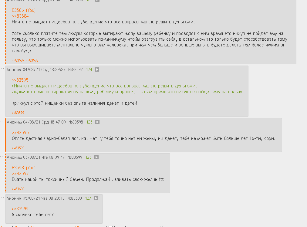 >>83071 > если ты не крепкий середнячок, заводить детей не надо. Середнячок это сколько? 30к? 60к? На семью минимум из 3х человек с неработающей женой? В Рф нет среднего класса, ты либо нищий, либо в достатке. Достаток это возможность купить квартиру в нормальном районе исходя из минимума 20м2 жилой площади на человека. Если ты можешь это купить, то все остальные няни и гувернантки для тебя не проблема. Если не можешь - такой же орк из хруща, которому метить на что-то выше шиномонтажа крайне странно (автомеханик от учителя в регионе ничем не отличается, кроме просранного на учёбу времени).