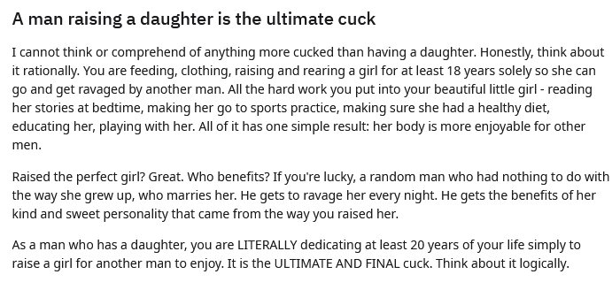 Ладно, не буду ходить вокруг да около. Иридиевый вопрос олдача: как вырастить дочку, не будучи при этом куколдом или муслимом? И еще риторический вдогонку: что должно быть в голове у мужика, который осознано играет в рулеточку с 50% шансом 18 лет выращивать ебательный материал для хачей и зумеров?