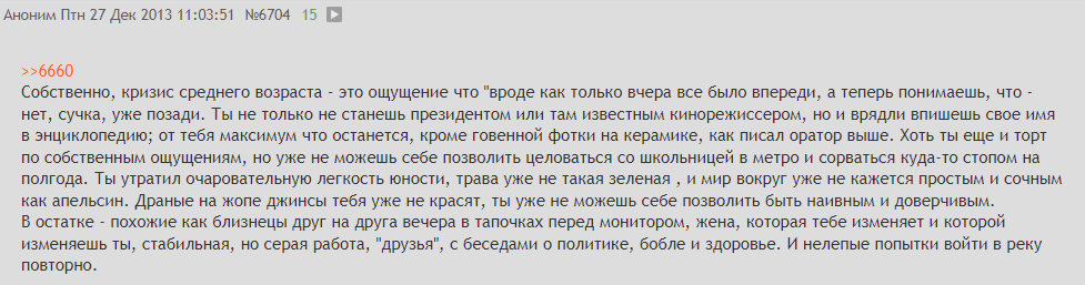 Как и писал все самое искренне и лучшее было в период 16-20/25 ет а дальше только фальшь и серьезные щи при любой погоде, мы же взрослые, епт. А если учесть все то лучшее что было это инфантилизм, неоптыность и такая же иллюзия как и все остальное то вообще пиздец.
