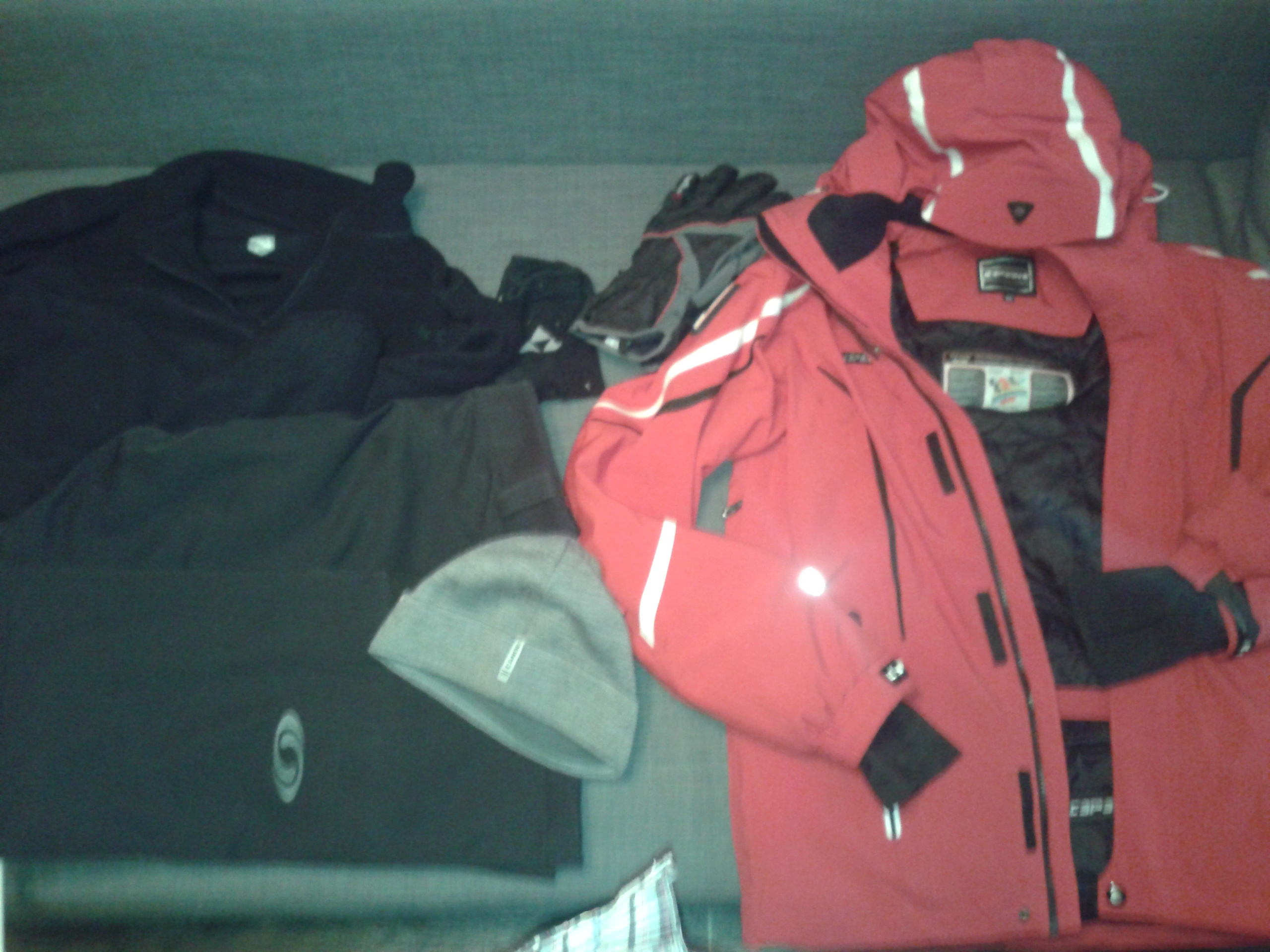 На ходу, на теле: - термобельё толстое, с начёсом, полиэфир - ветровка из полиамида, плохо промокает, плохо дышит, не глухая, швы не проклеены. - перчатки, шапка + гуф, чтоб нос не мерз и сопли не текли.