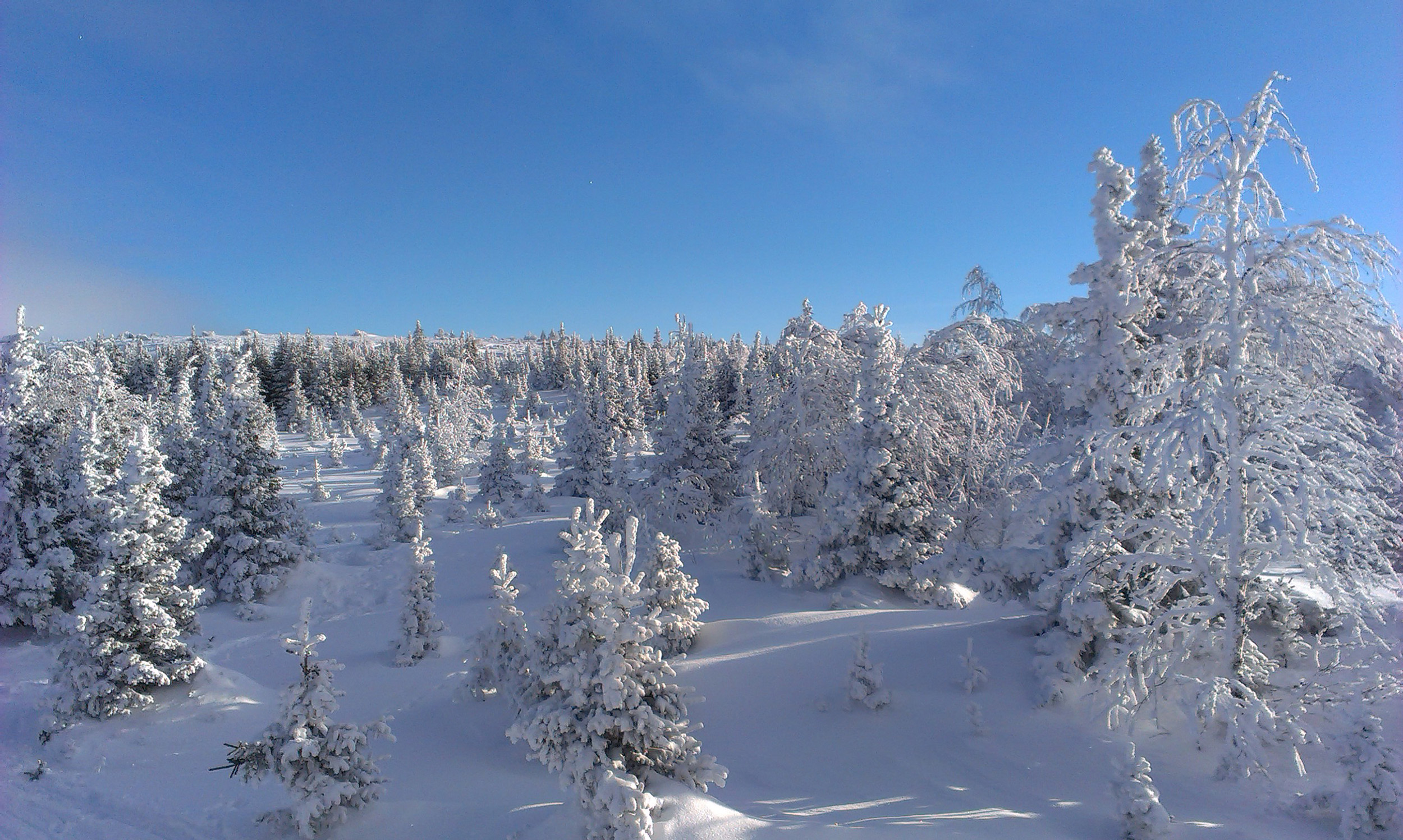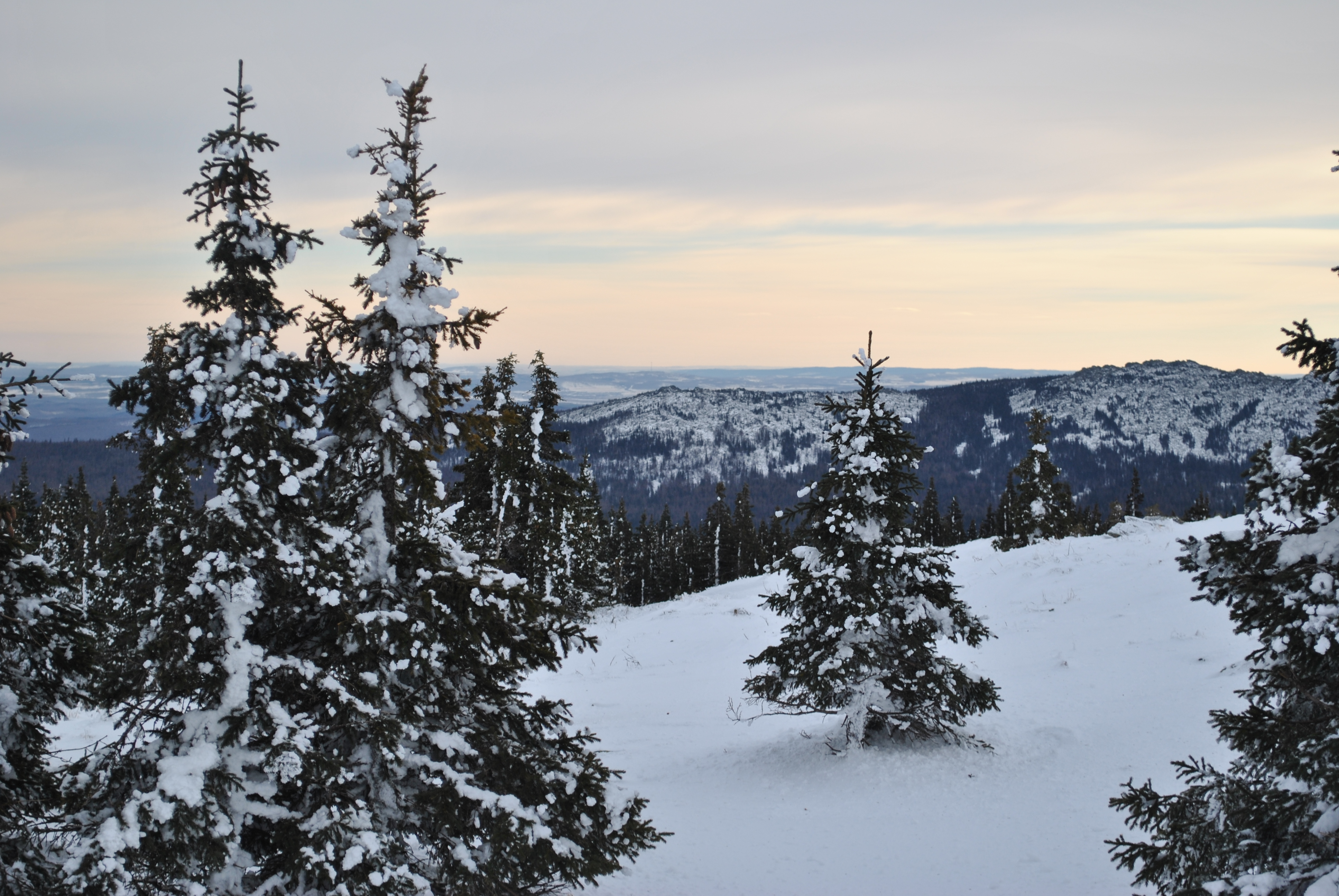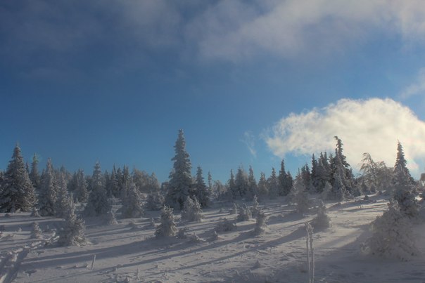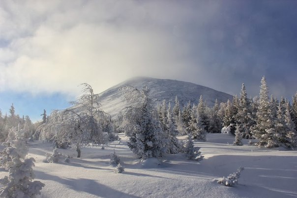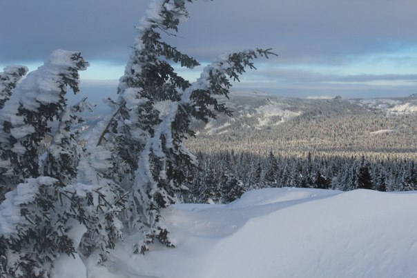 А вон и Большой Иремель через деревья показался. Красиво! Да и вообще вокруг как в сказке было. Не знаю как тут летом, не бывал, но зимой уже второй раз. Пейзажи завораживают.