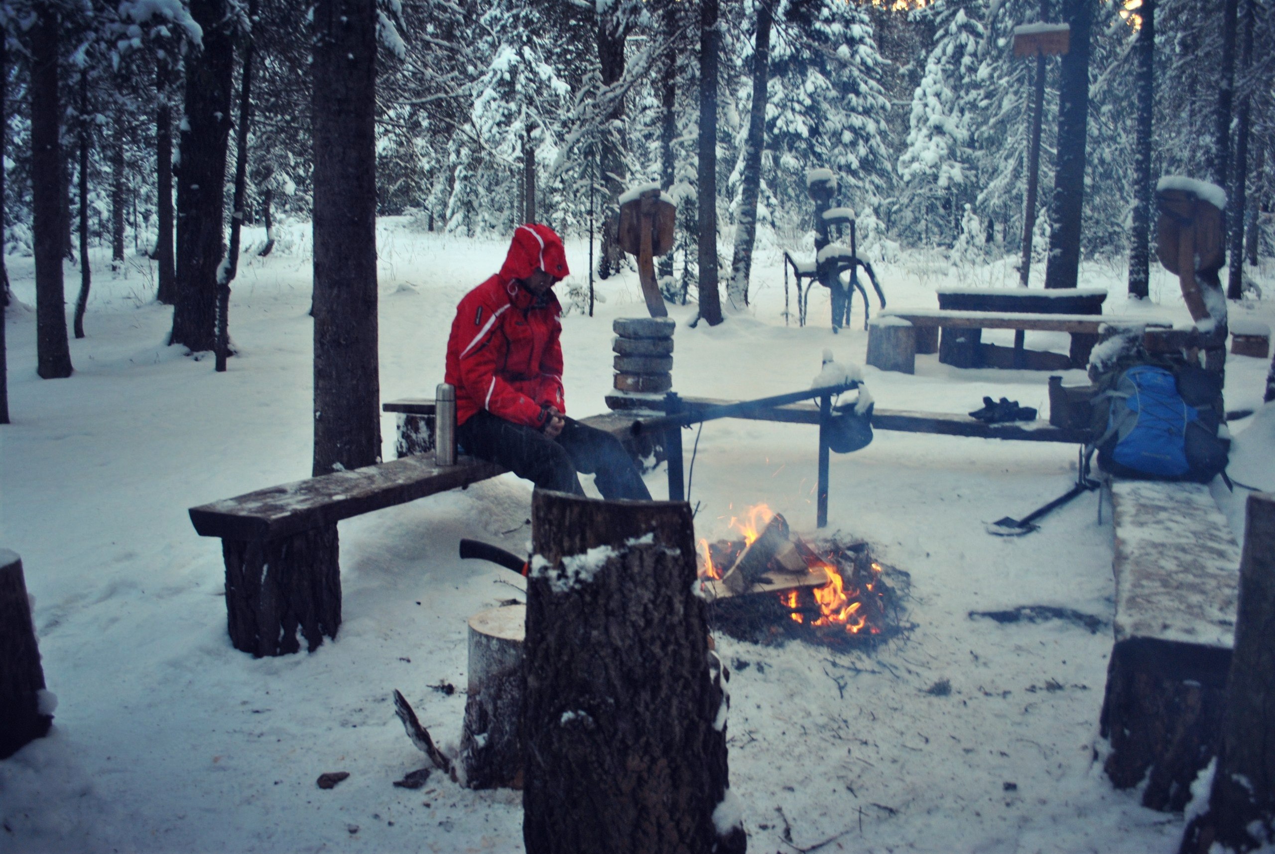 На кордоне есть лавки, кострище, напиленные полешки. Там было очень комфортно, по крайней мере с пути. Я было пошёл за полешками, нарубить дров, однако смотрю - идёт охранник, несёт из избы своей охапку. На, говорит, эти посуше будут. И правда. Я его поблагодарил, и занялся костром.