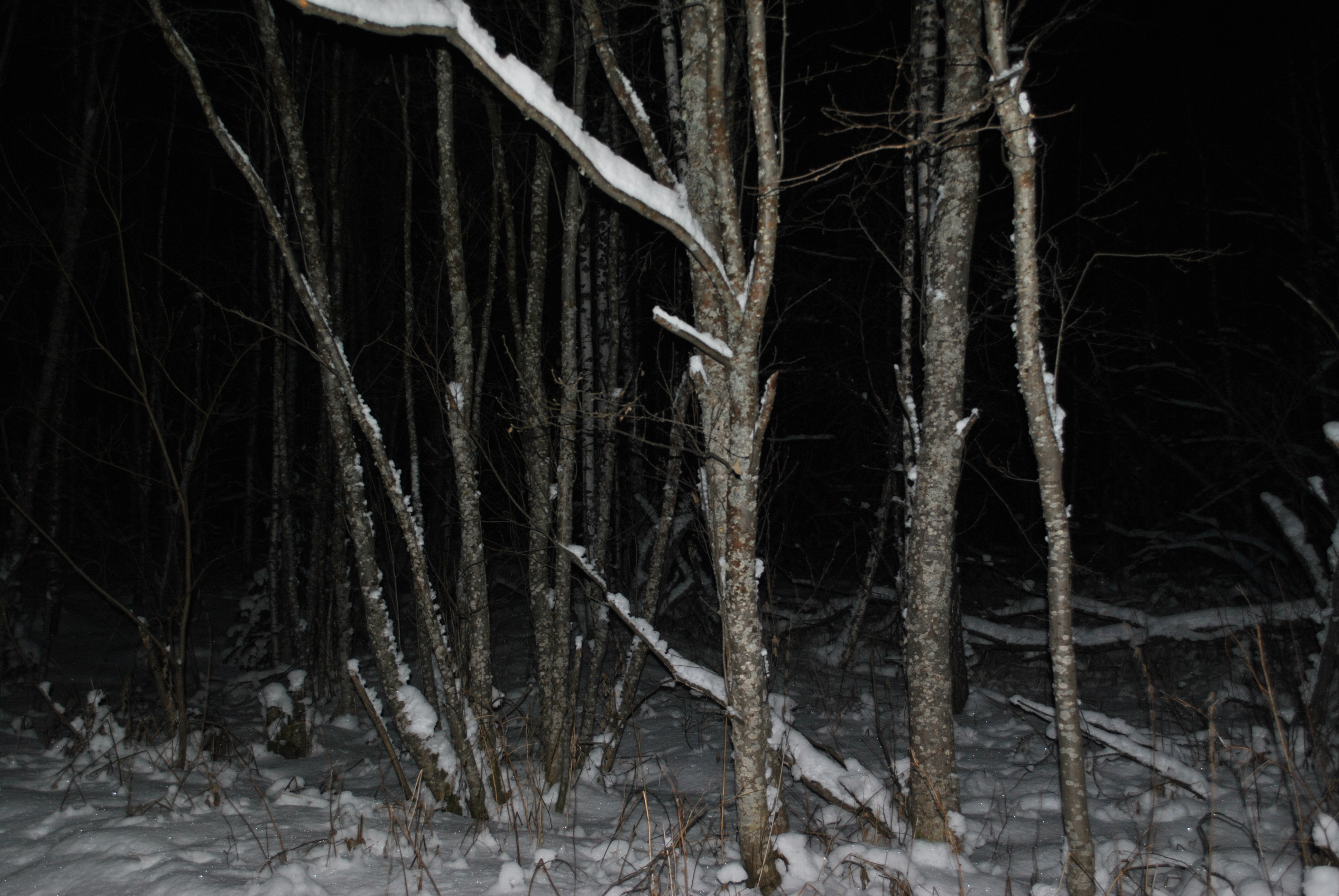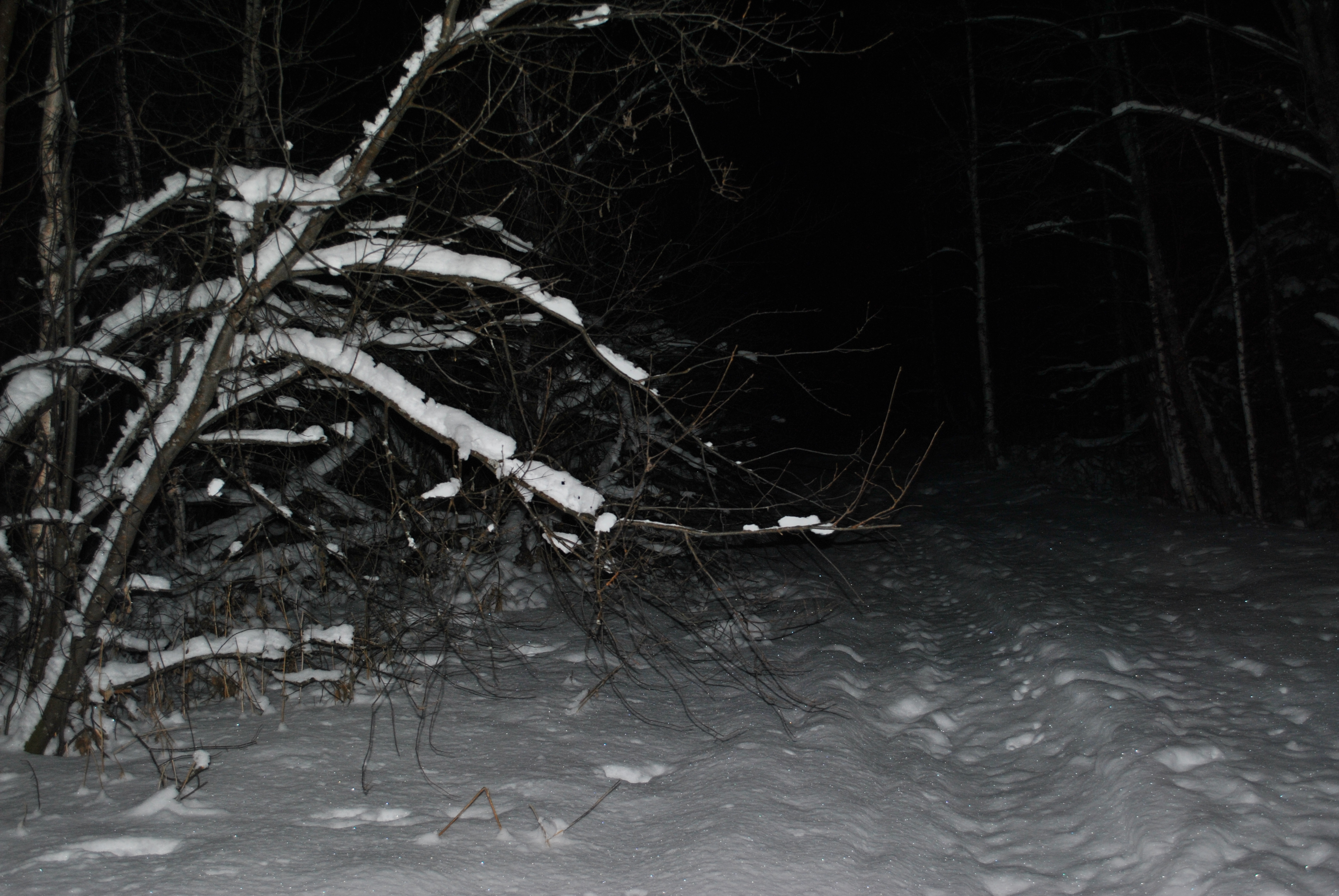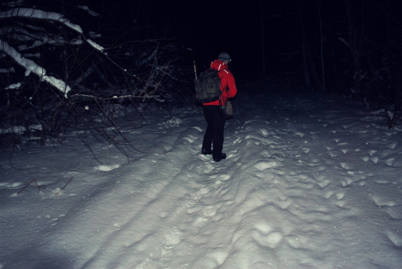 Через 20 минут были на тропе, ведущей на кордон. Было очень много следов зверей, зайчиков, лисичек, ещё каких-то млекопитающих. Жене было страшно идти. Налобный фонарь освещал ночной лес и его причудливые формы. Человеческих следов не было.