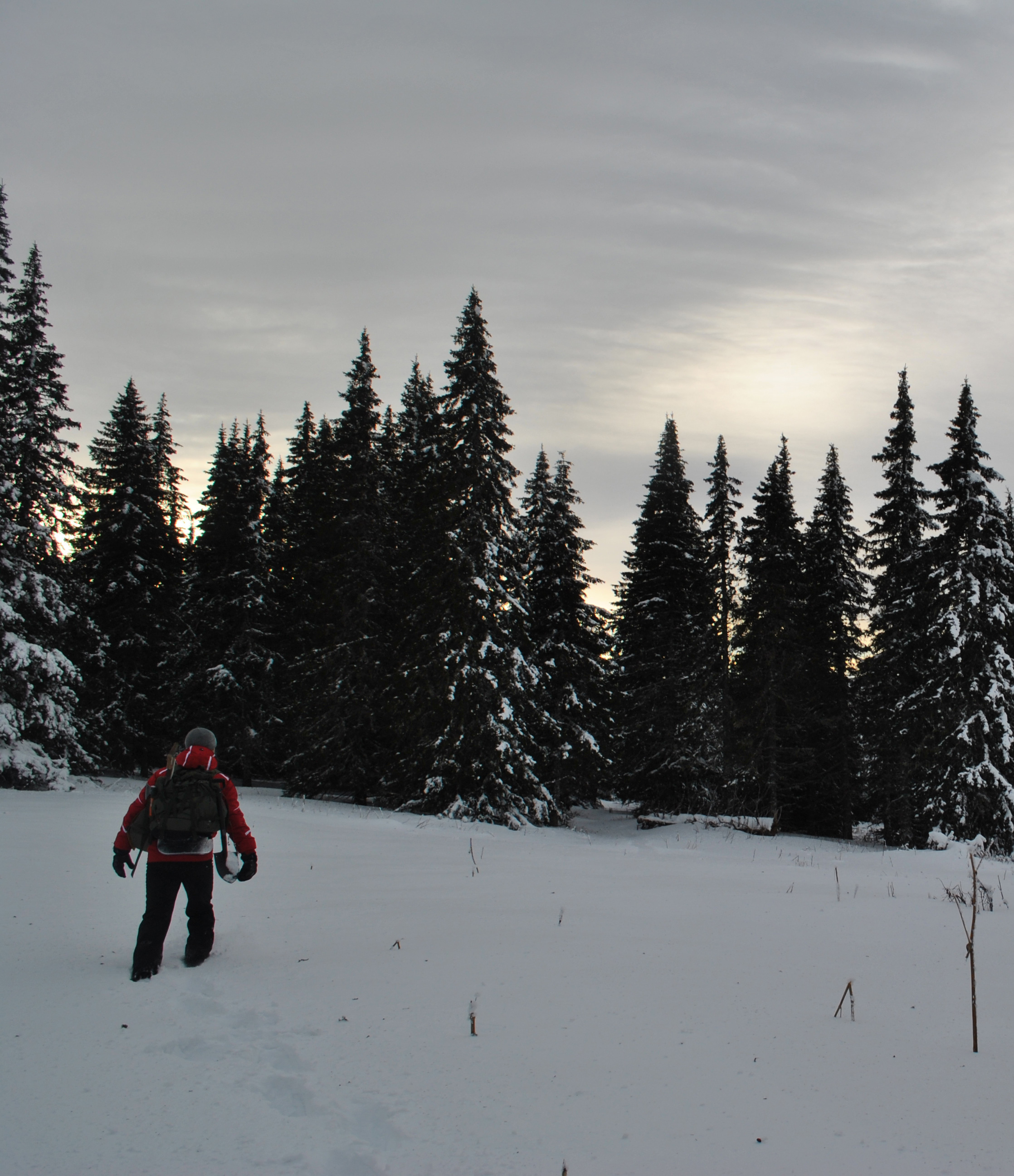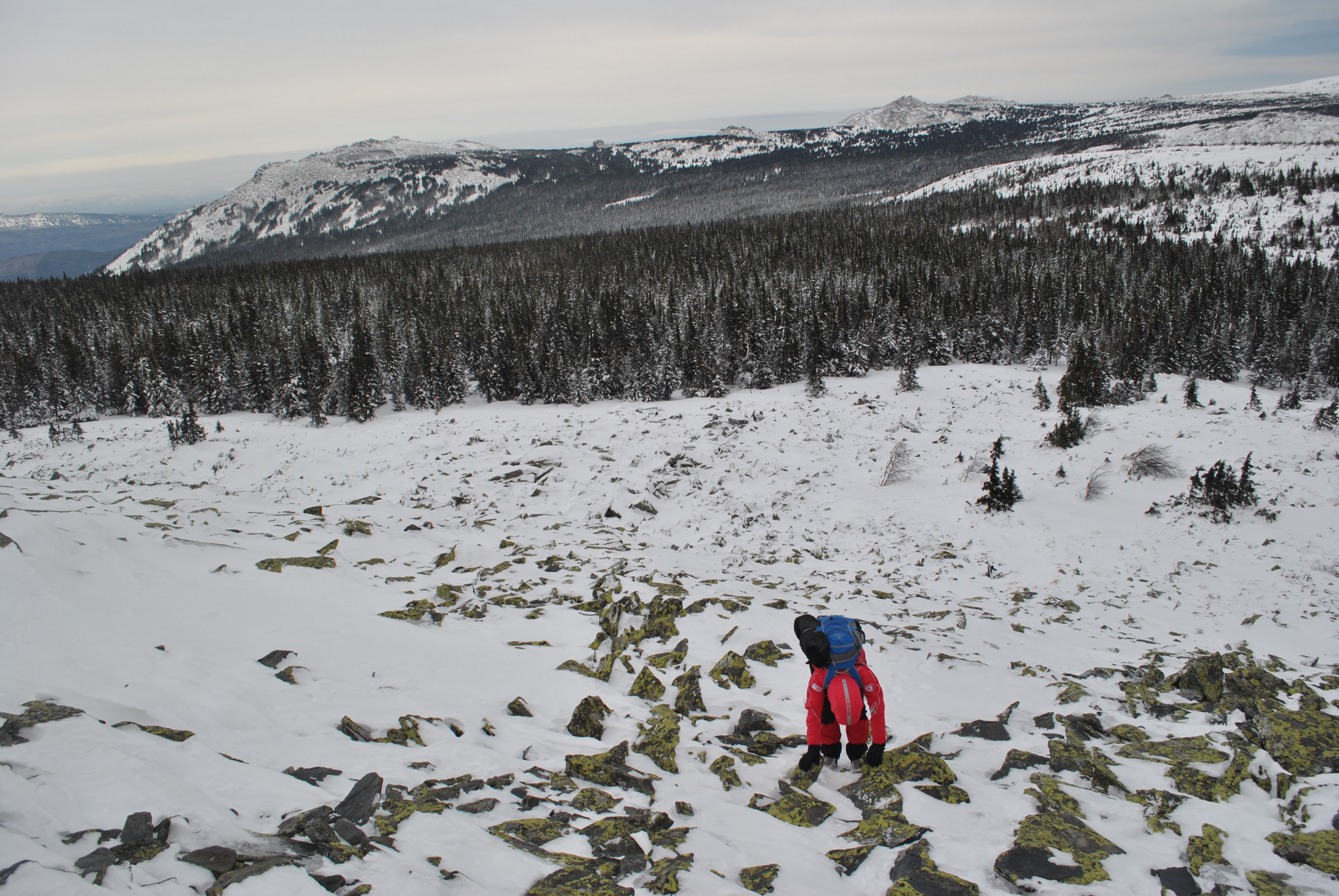 Т.к. в январе на вершине будет холодно, и скорее всего, холодный ветер, на долго там не задержимся, спускаемся обратно. И идём обратно, но в том месте, где мы вышли к подножию горы Большого, сворачиваем на Малый Иремель.