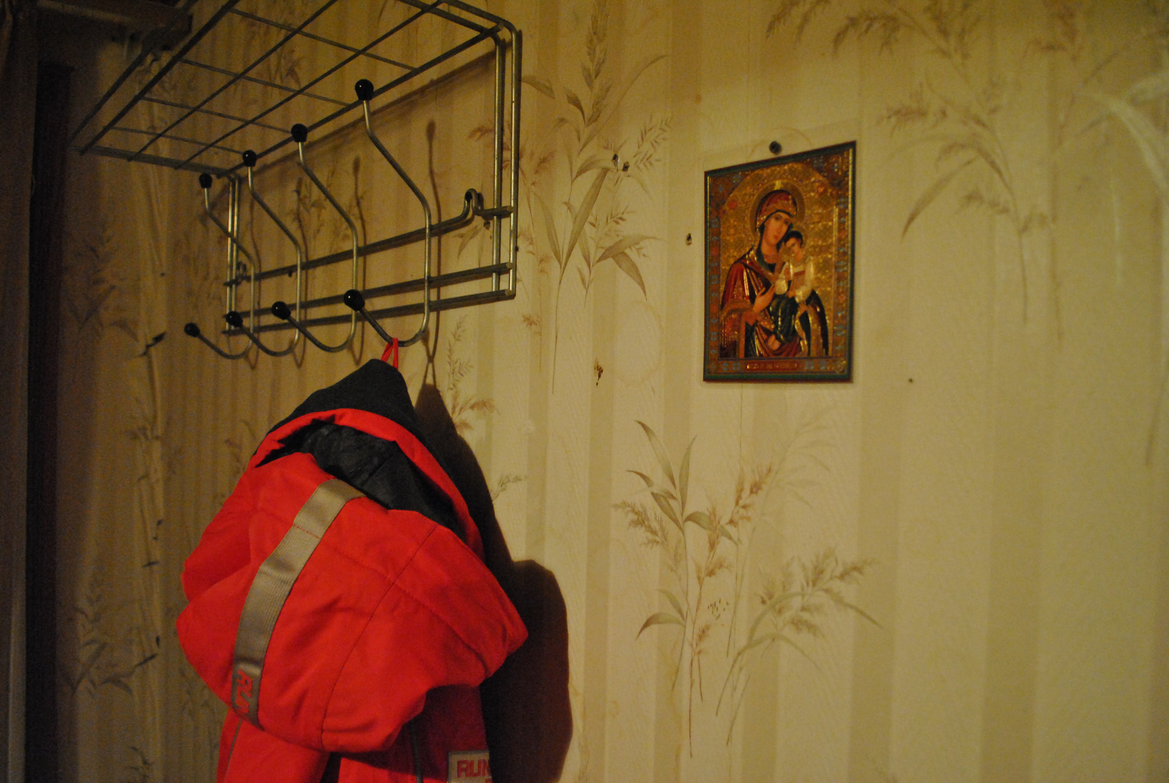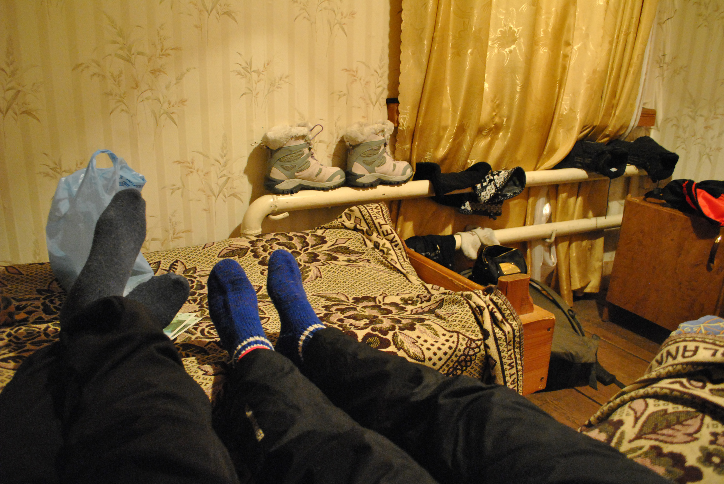 Конечно, я ещё ни разу не останавливался в таких местах. В комнате вё скрипело, была древняя мебель, иконы, разрисованные обои. И слышно было всё что происходит на кухне и в том большом зале. Атмосферно, в общем. Но мы были рады. Разделись, поставили всё на батарею сушится.