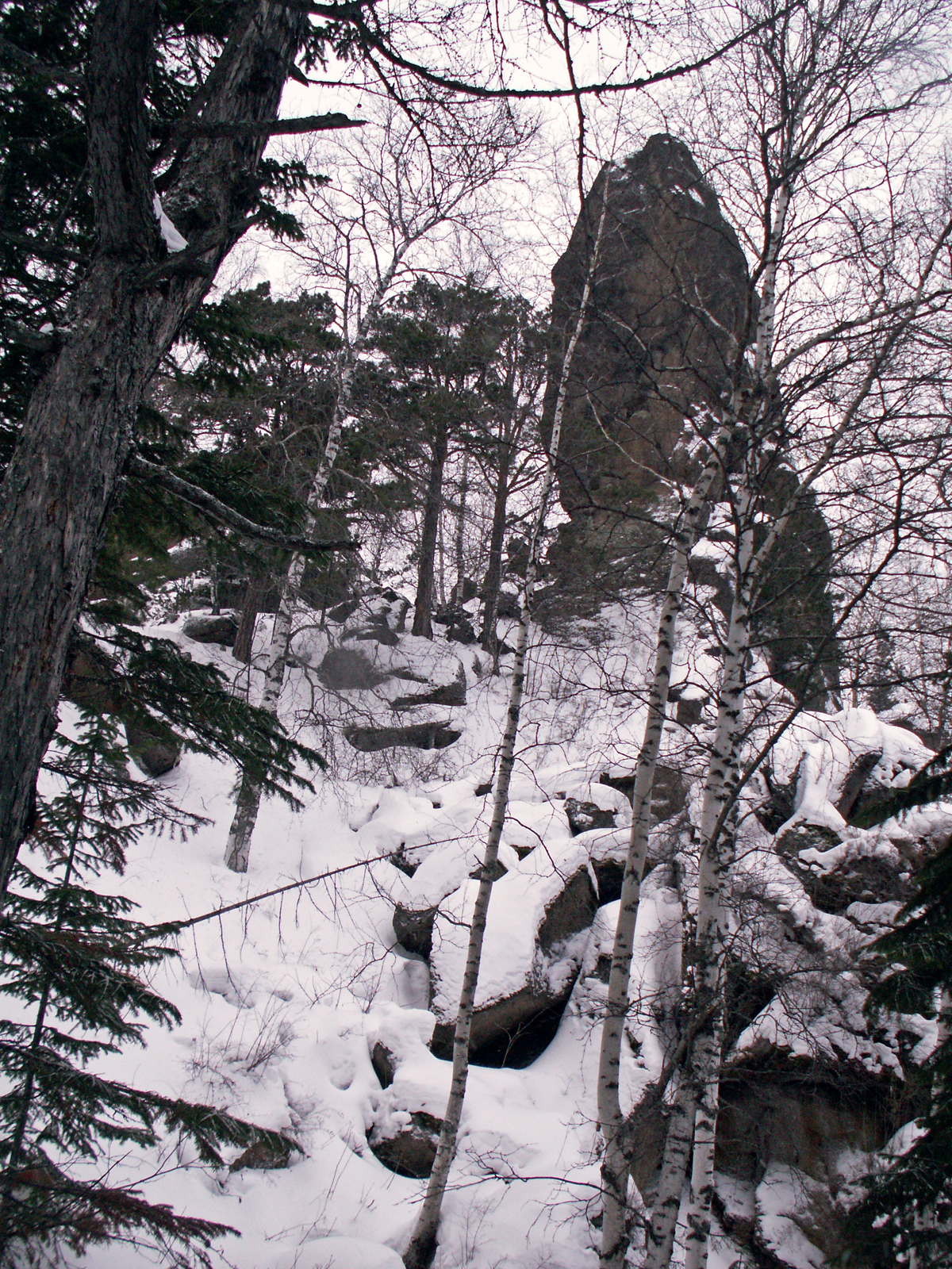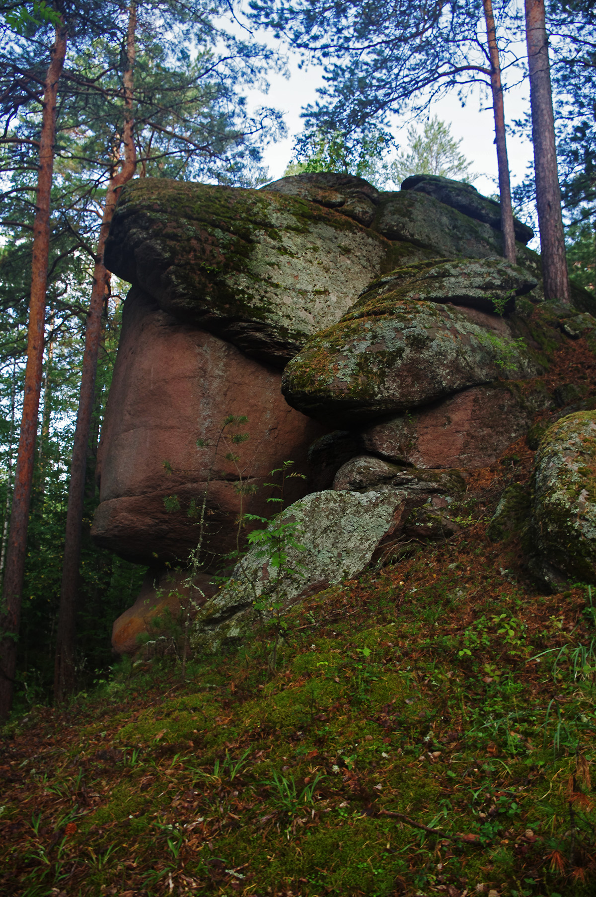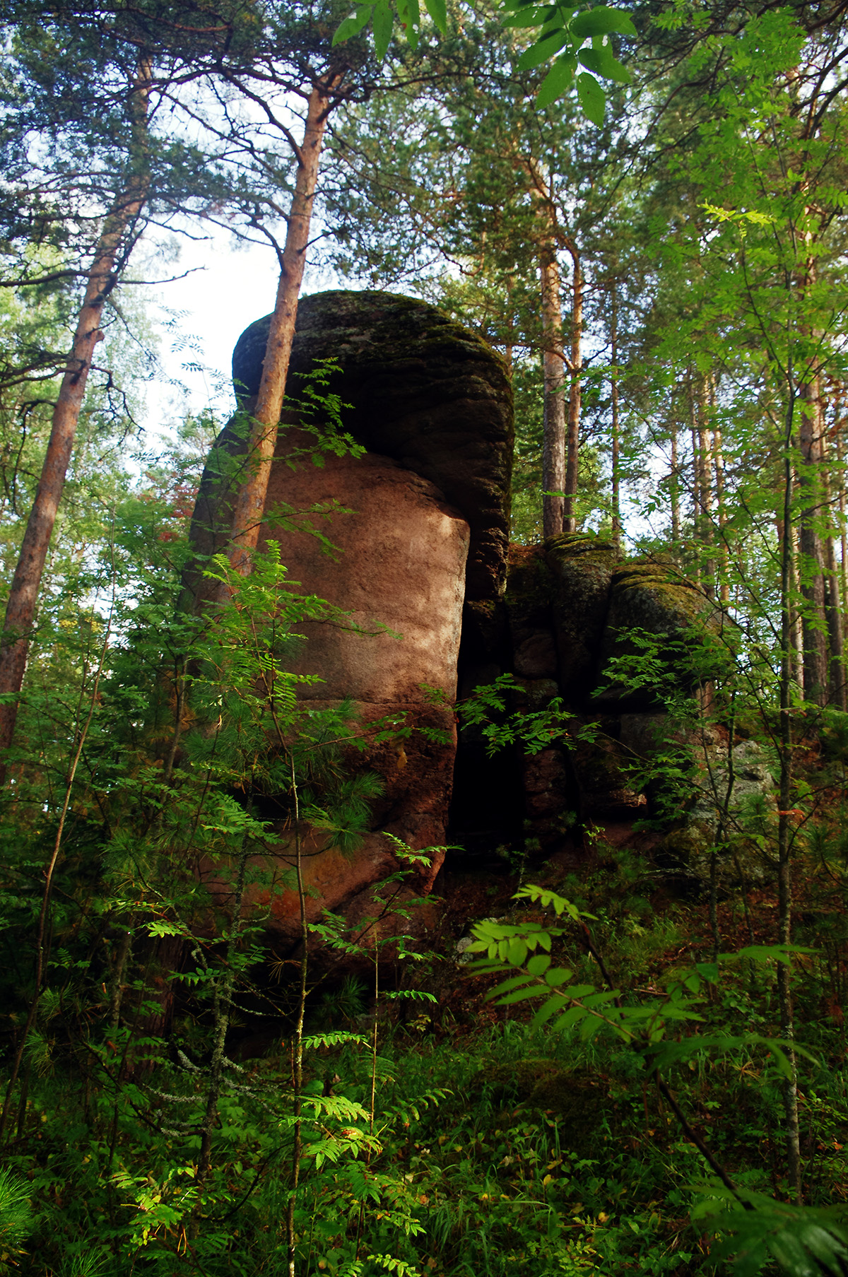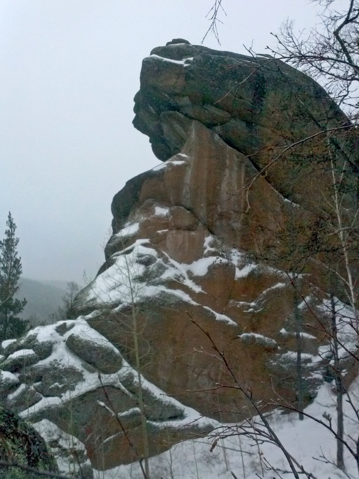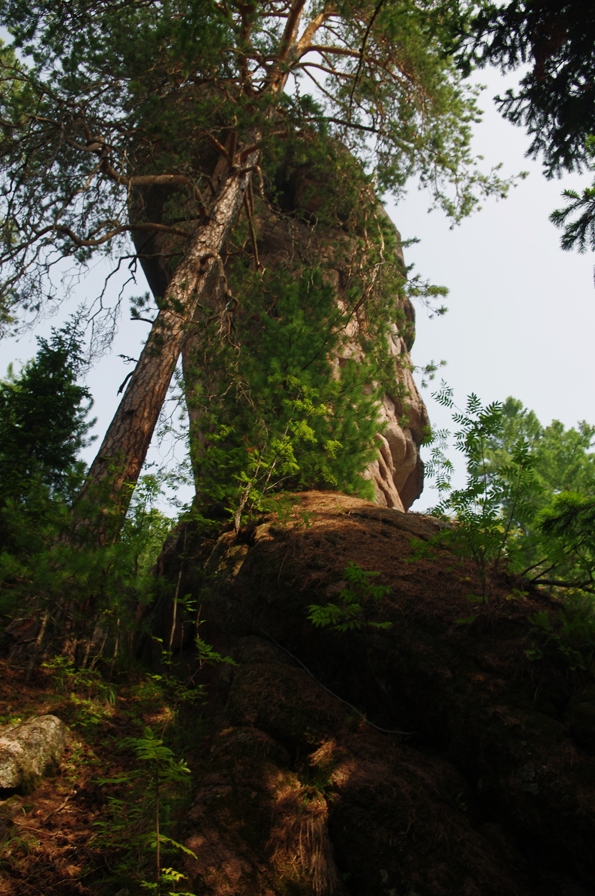 Конечная точка - скала "Парус" (хотя больше похожа на голову бритого самурая). Хотел полазить там еще, т.к. есть очень много интересных локаций, но телефонный навигатор почему-то жутко пиздел и не позиционировал нормально на карте. Посмотрел викимапию - в двух шагах буквально назад завернул от "Колдунов", блядь.