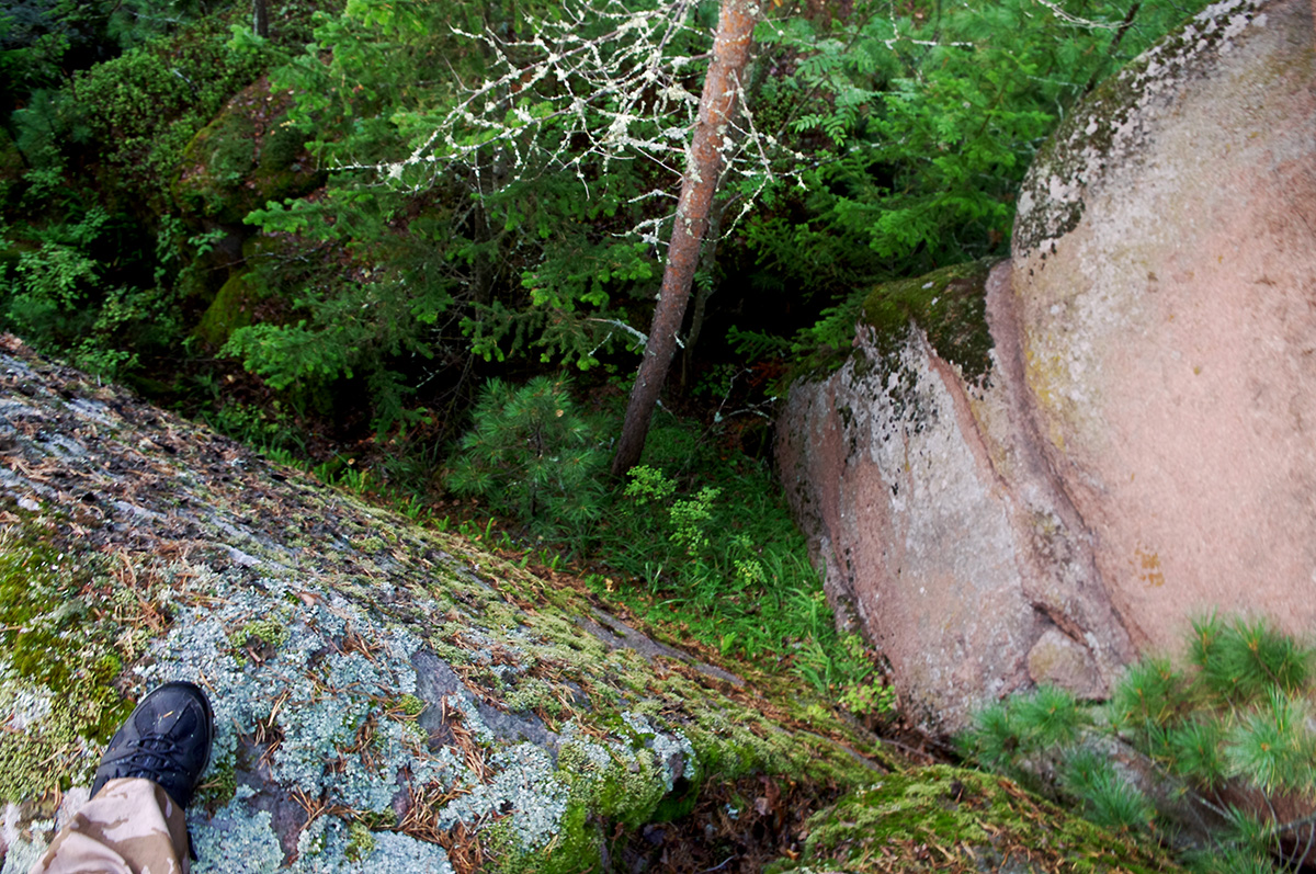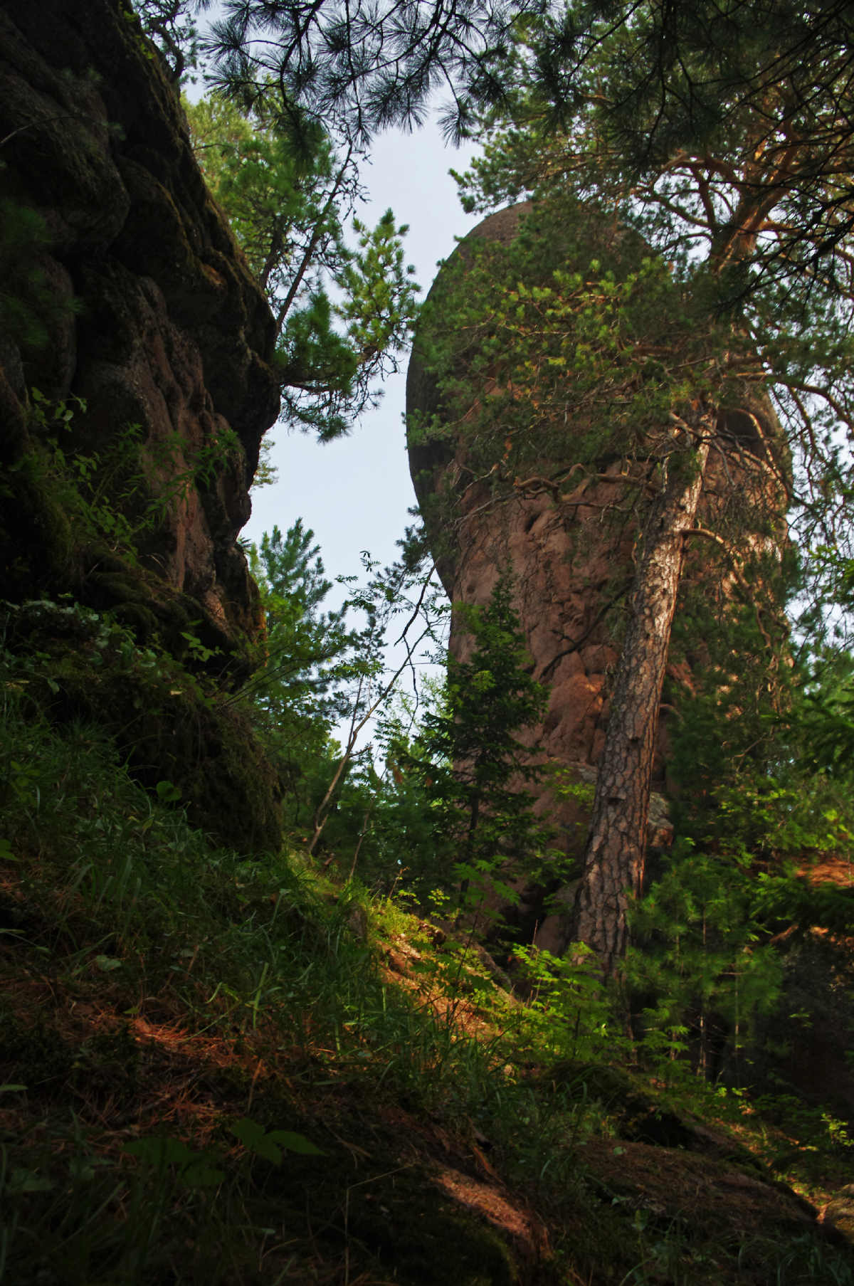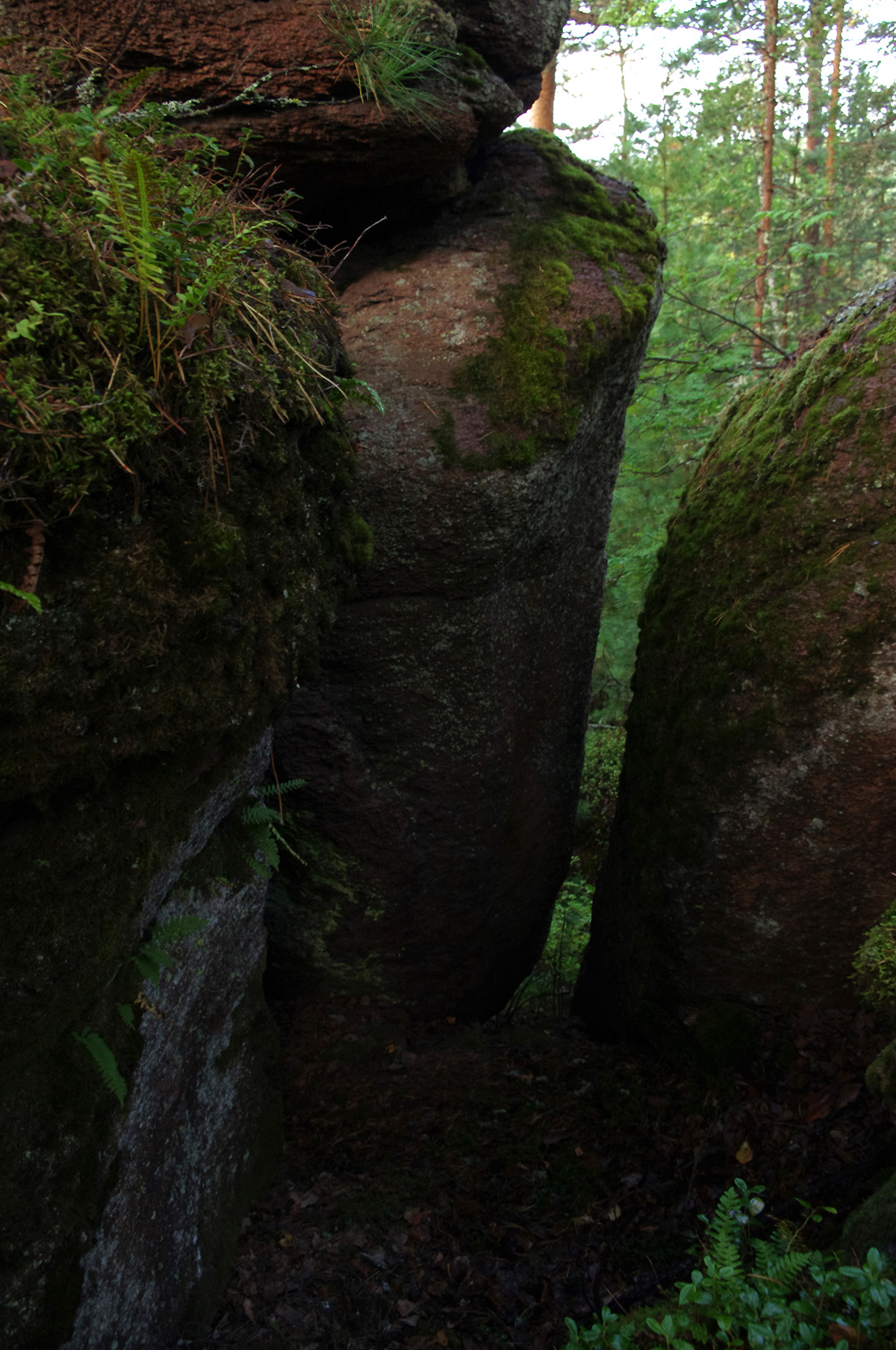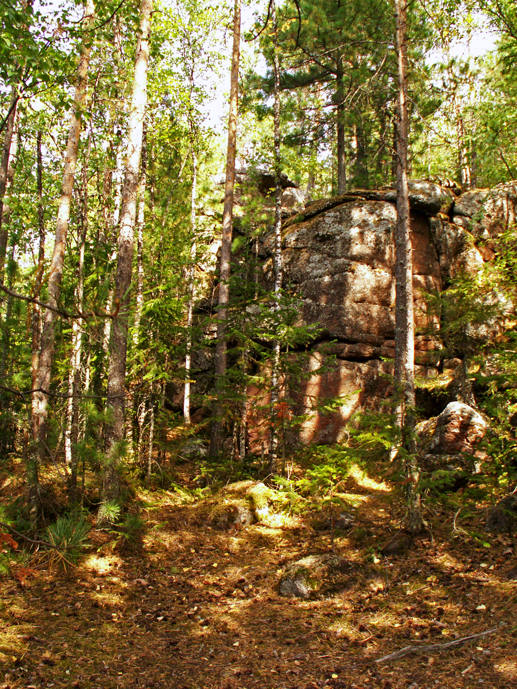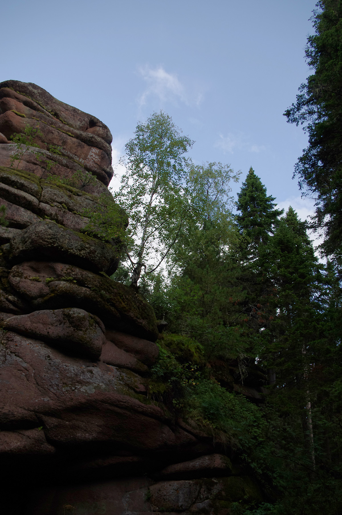 Конечная точка - скала "Парус" (хотя больше похожа на голову бритого самурая). Хотел полазить там еще, т.к. есть очень много интересных локаций, но телефонный навигатор почему-то жутко пиздел и не позиционировал нормально на карте. Посмотрел викимапию - в двух шагах буквально назад завернул от "Колдунов", блядь.