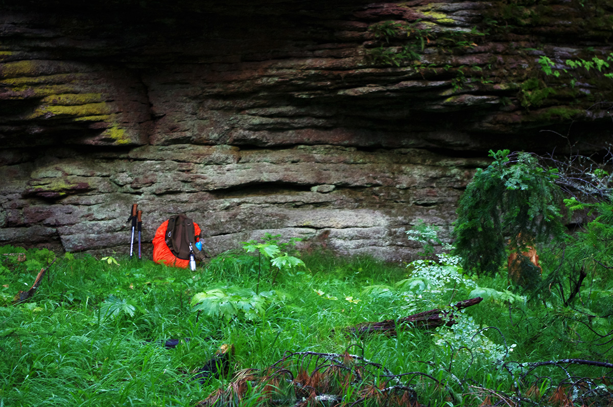Двинул с утреца, часов в пять. Прямо в лесу попал под грозу. Ебашило так, что я чуть в штаны не насрал. Метаясь кругами, внезапно, обнаружил скалку которую раньше не мог найти, всё время проскакивал. Под ней и пересидел.