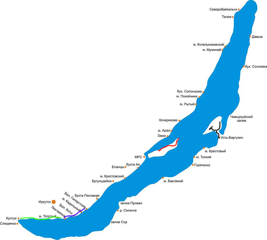 >>4789 >подскажи куда можно сходить летом. Недели на 2-3 пешком. Пешком + трансфер на маршрутках, электричках. 1. Красная линия - Ольхон. 2. Синяя линия - Большая Байкальская Тропа 3. Зелёная линия - Кругобайкальская железная дорога. 4. Чёрная линия - Полуостроа Святой нос