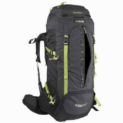 Из дешевых могу порекомендовать Трамовский турист 90. С их литрами как рахз 75 выйдет. Из нормальных рюкзаков с задачей отлично справится татонковский бизон - его хоть на восхождение с собой брать можно. Но есдинственно что из-за супер-мощьных материалов он сам будет весить ~ 3,5 килограмма (тамас или юкон были бы дешевле, но там нет фронтального входа).