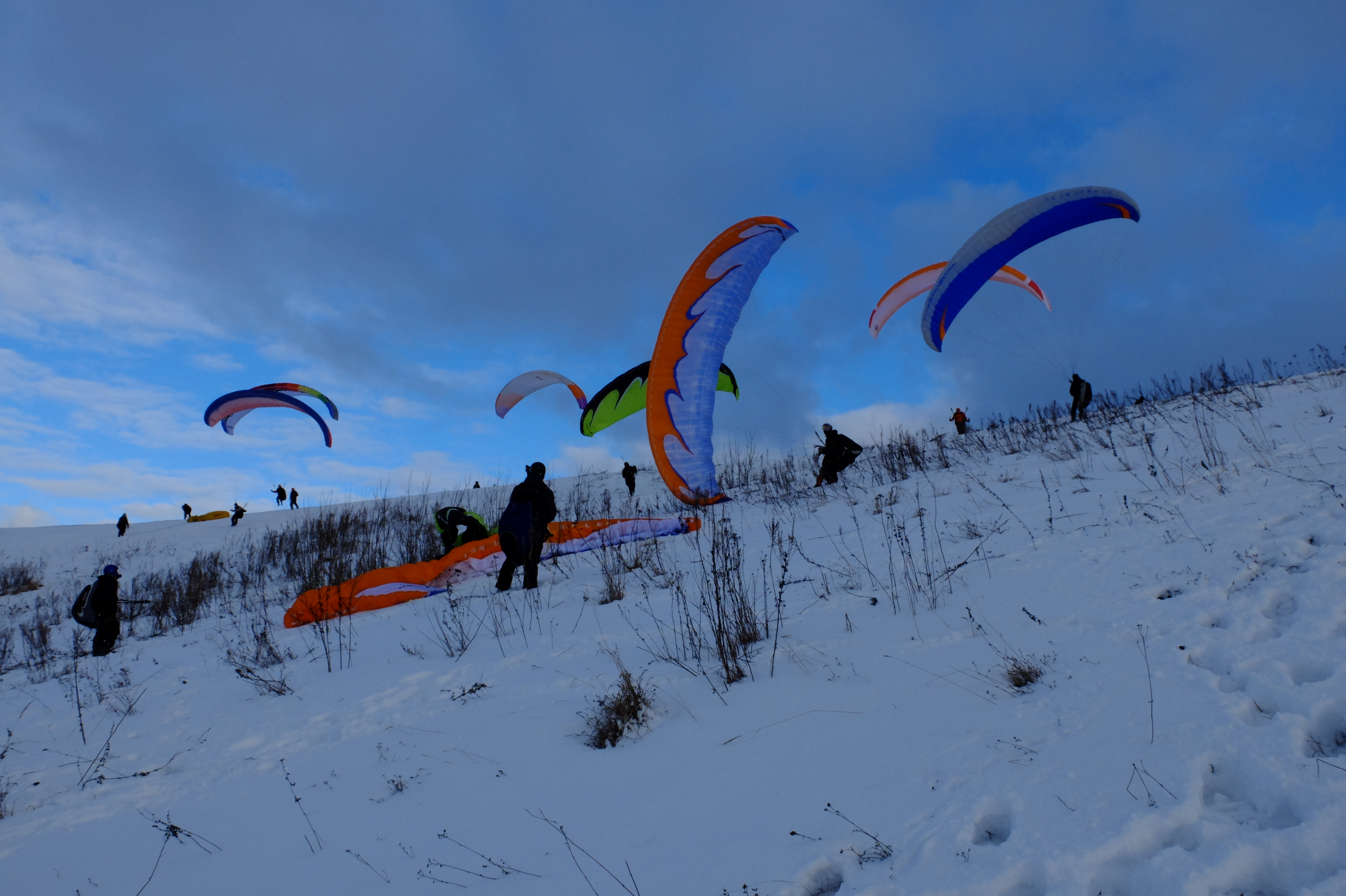 Прогноз был летный, но адский ветрище спутал карты, в итоге с горки никто особо не летал, бегали по полю.