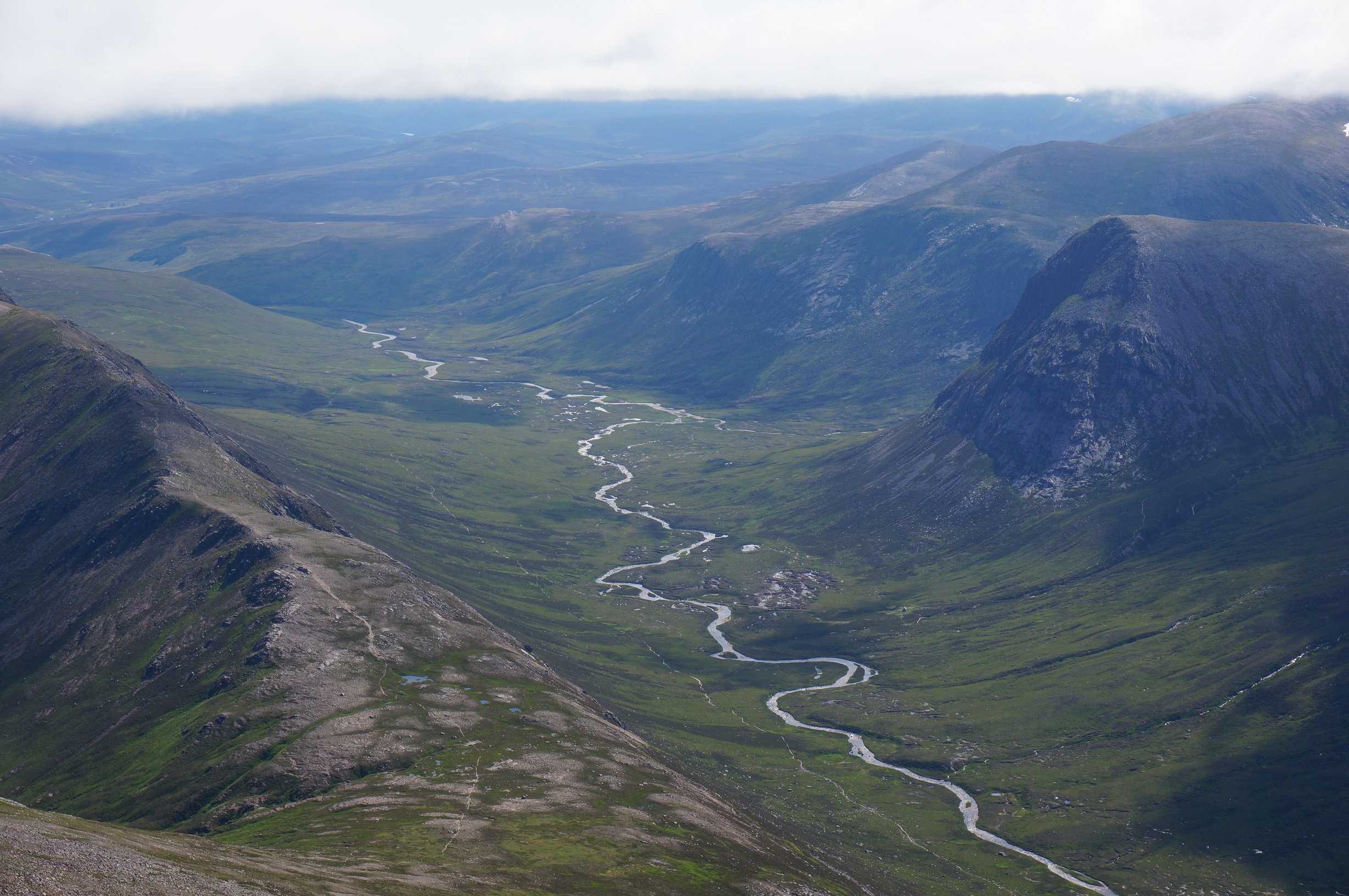 Короче, сходил я в Шотландию, точнее в Каирнгормы. Во-первых, стоит сказать, что места совершенно не дикие, хотя я пыталася найти наиболее "дикий" нац. парк, но по почти всем тропам ходят микрорюкзачники, т.е. очень мало троп, по которым ты бы не прошел, уйдя на день из какого-нить пункта, но мы мужественно тусили неделю, просто не добираясь до них. Совсем дикие места мы увидали, когда свалилились с одной из гор не по тропе (точнее какой-то долбаеб в осме нарисовал, что там якобы есть тропа, а я решил проверить, лол). С другой стороны, приятно, когда спускаешься спустя неделю с гор остановиться в кемпинге со всеми удобствами. Во-вторых, ландшафт хоть и горный, по всему остальному Карелия Карелией, благо широты те же. Черника, огромное количество вереска, болота (болота, болота, болота), ельник, куча грибов, мох, даже морошка есть. Правда, вместо комаров омерзительные мошки, которые адово кусают. Долина, которая сверху смотрится дико круто на деле оказывается болотным пристанищем мошек, лол.