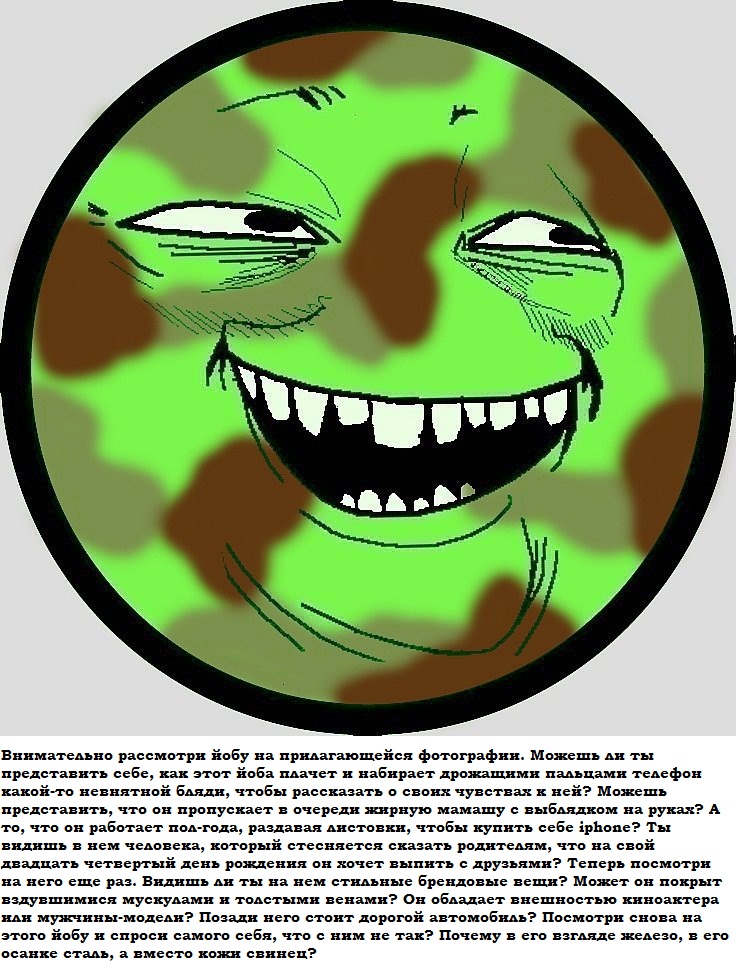 Маскировка - это важно весело и интересно! Не ясно, с чего тут на доске такое пренебрежение и НЕНАВИСТЬ к камуфляжникам? Видимо, это от того, что они выглядят круто и по-армейски. Жестокие и брутальные, они идут в своих армейских ботинках и сама земная твердь прогибается под их неумолимой пятой! Ничто не способно их остановить, никто не способен их заметить. Они подобно диким животным мастерски маскируют свое присутствие, чтобы в случае нужды действовать ВНЕЗАПНО и эффективно.