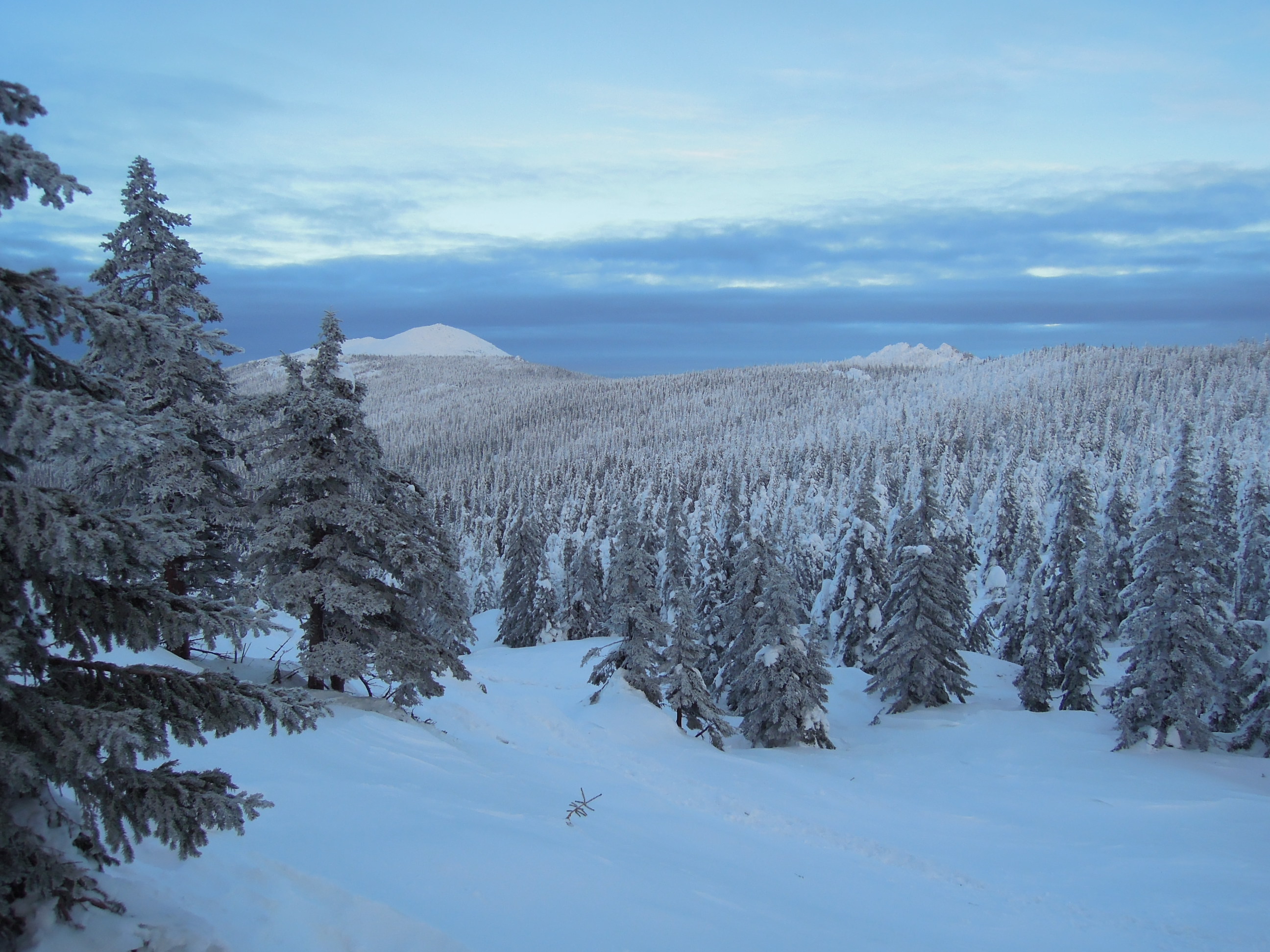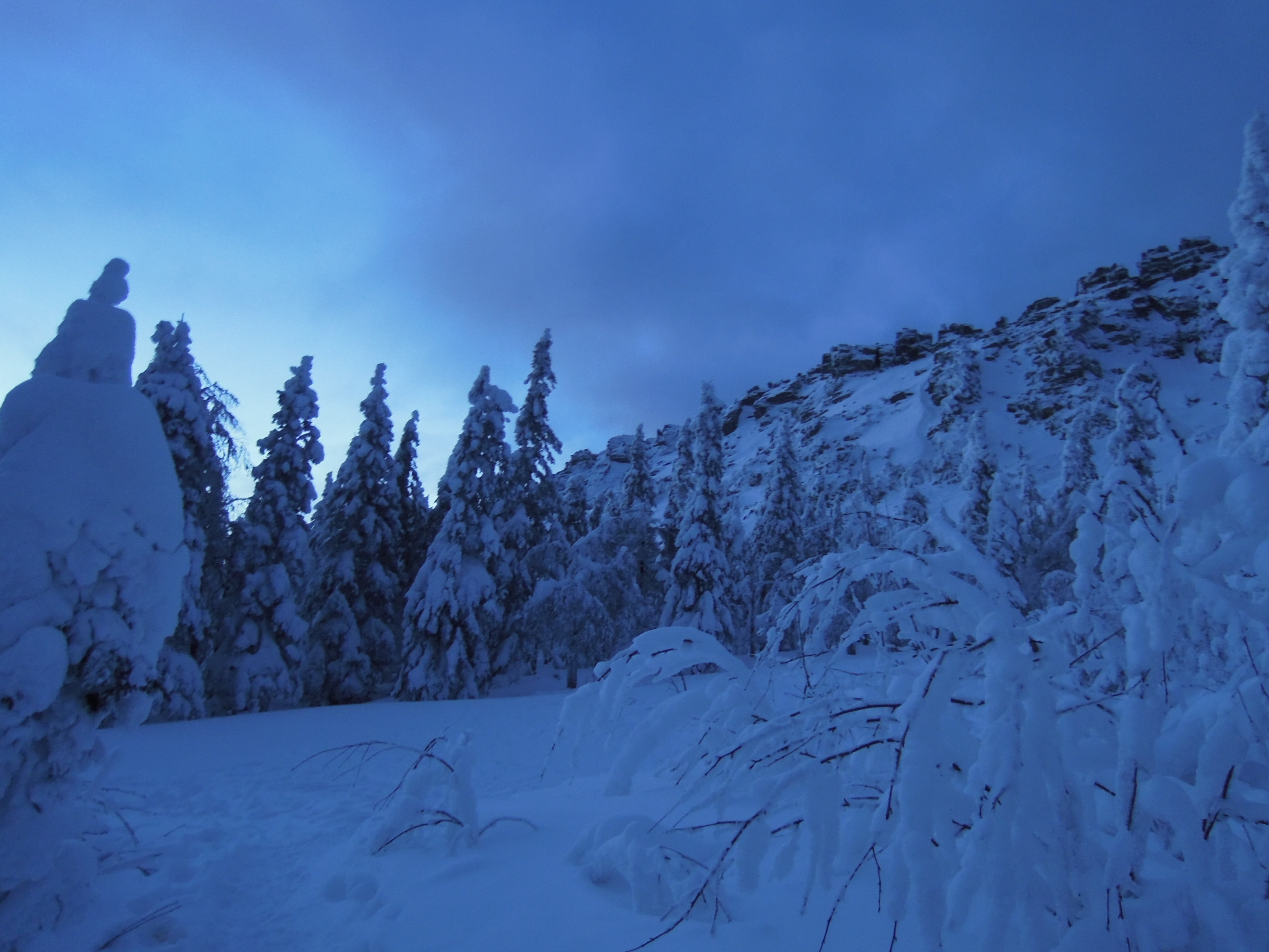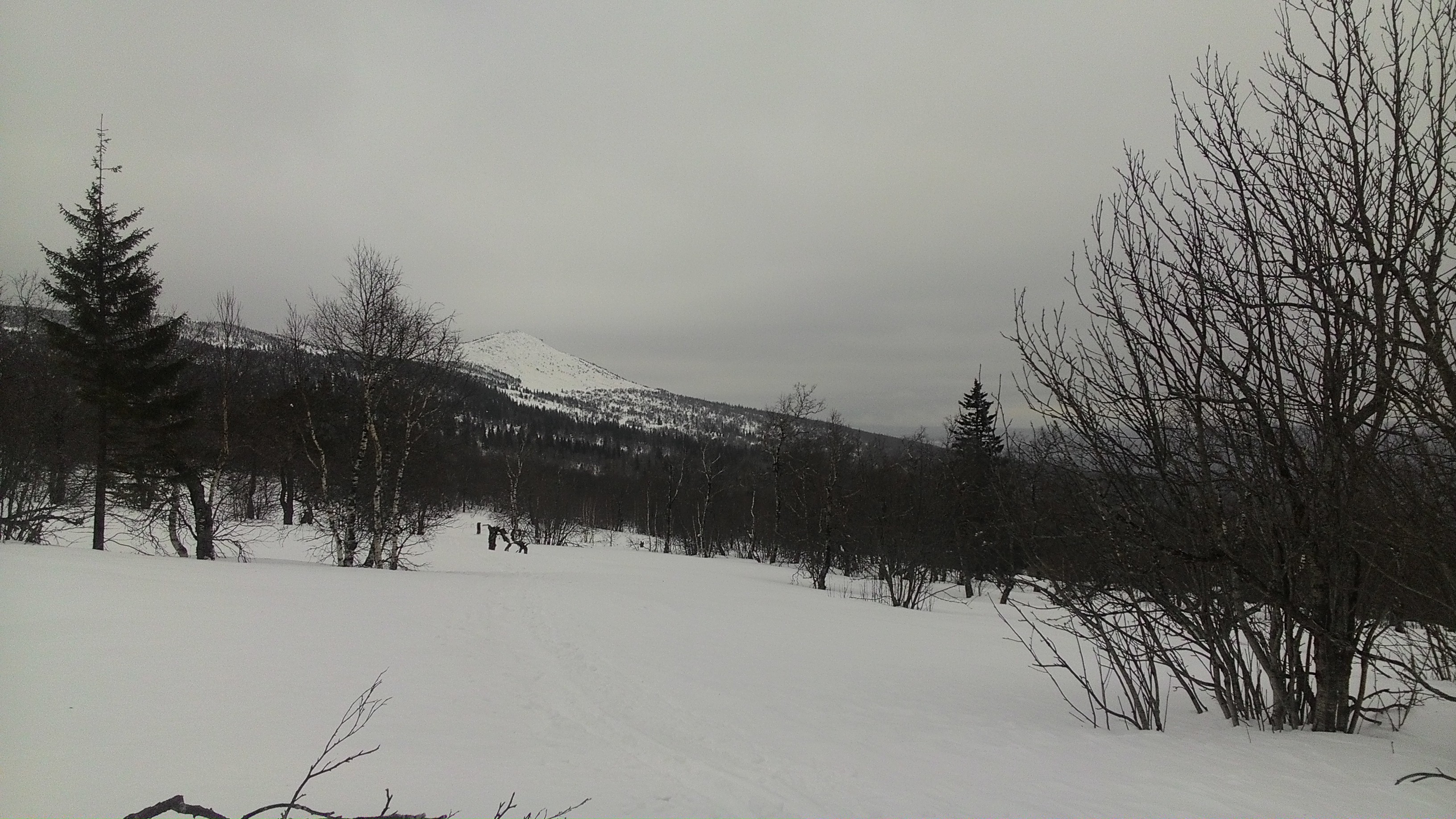 Фоток мало ибо лень и не чем снимать особо. На картинке Ю.Урал, хр. Уреньга, г. Вторая сопка. Дошел до границы леса от места фоток за 40 мин, тк. лыжня почти сразу кончилась, потом повалил снег и вершину затянуло. Развернулся и пошел назад.