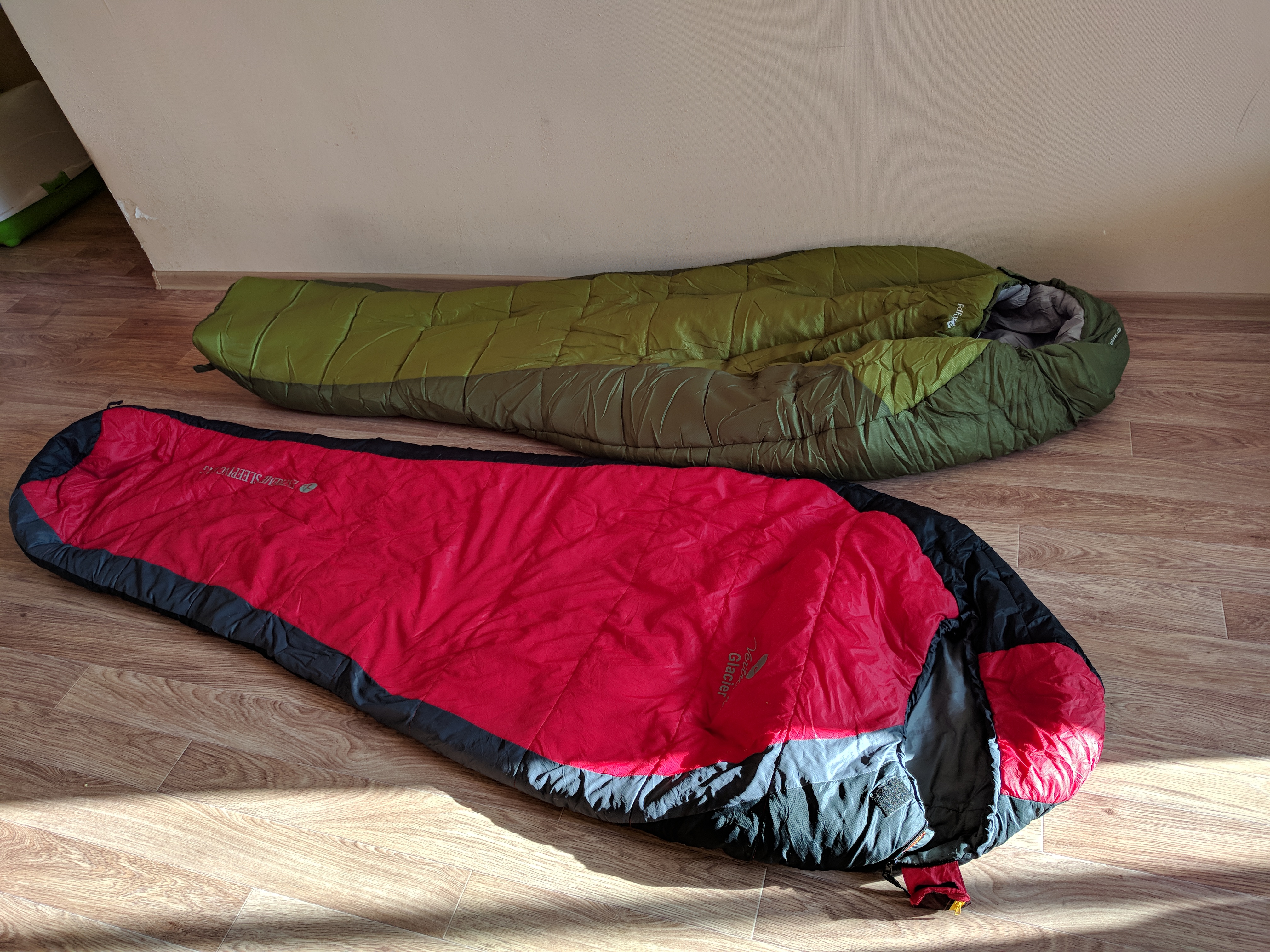 Ну вот фоточки редфокса эксплорер -40. Габариты в мешке - пиздец, мешок на фотке видно что ниоч, стропы узкие. Вес - ну для зимнего наверное приемлемо. Сравнение со старым спальником (который весит 1700 и изрядно похудел). Редфокс толстый, объемный, выглядит очень теплым. Материал внутри приятный, не голимая синтетика, при прикосновении к которой голой кожей сразу начинаешь потеть. В ногах спальник заметно толще, однако узковат и зело тесен, балет в таком не станцуешь.