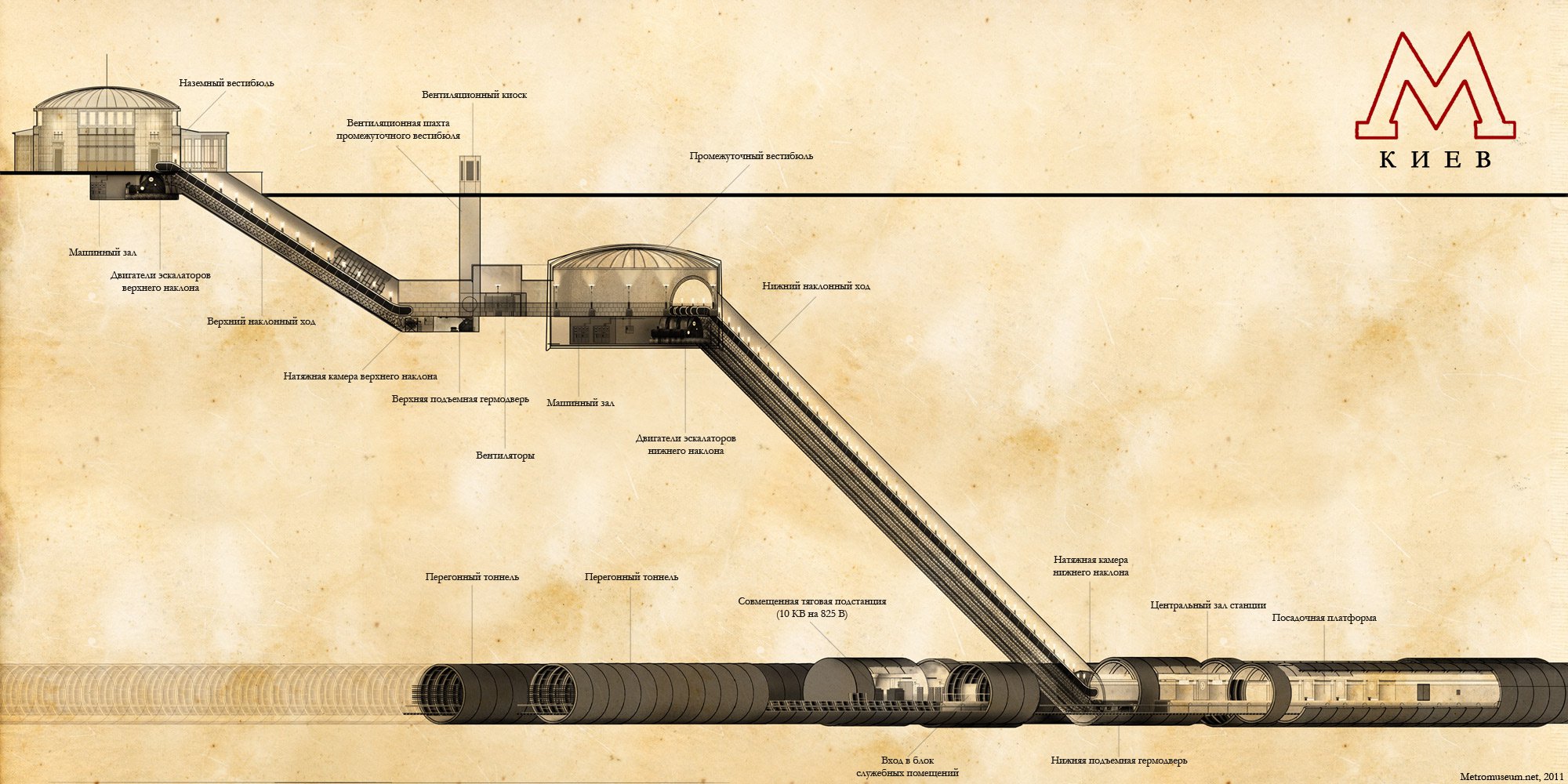 Шахтные стволы. Если специальными матерящимися мужиками с отбойными молотками копать шахту вертикально вниз, полученное сооружение будет называться "ствол шахты". Если копать под углом в 30 градусов (в трезвом виде), то такое сооружение будет называется "наклонный ход" или "большой наклон" (жаргонное "наклонник"). При небольшой сноровке, внизу наклонника можно отыскать горизонтально прокопанный тоннель. Как правило, он называется "строящейся станцией метрополитена" а именно, ее "центральным ядром" ("центральным залом"). По бокам от станции вы можете найти так называемые "станционные залы" выложенные из чугунных тюбинговых колец меньшего диаметра. В торцах станционных залов, есть еще более маленькие "перегонные тоннели". Как правило, тоннели далеко не идут и быстро заканчиваются грязными досками или ржавым горнопроходческим щитом (или "эректором" - упрощенной версией щита, помогающей устанавливать тюбинги в нужное пространственное положение.) Из-за некоторых особенностей гидроизоляции тоннелей (есть/нет/сгнила/украли), местами круглый год идут осадки в виде дождя. Стены всех круглых тоннелей сделаны из так называемых "тюбингов".