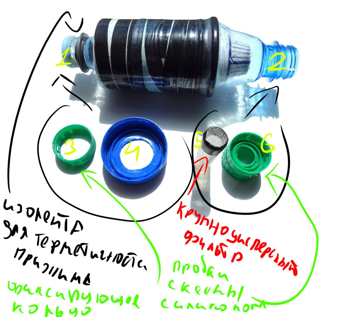 >>43913 Далее готовим соединение с бутылками в которых носите воду. Я ношу в большой четырехлитровой и мелкой в поллитра - поэтому у меня переходники под них. Переходник на обычную бутылку делается таким образом - берутся две пробки, склеиваются силиконом и потом в них делается отверстие для воды (6). Для пробки большего диаметра (4) необходимо вырезать отверстие такого диаметра, чтобы она доходила до последнего ограничителя на горлышке (1), предыдущий ему мелкий ограничитель легко срезается горячим ножом. После того как большая пробка (4) надета - для ее фиксации используется обрезанная мелкая пробка (3) - которая прижимает ее (4) к большому ограничителю горлышка обмотанным изолентой для лучшей герметизации (1). Так-же стоит сделать крупнодисперсный фильтр на входе фильтра (2). Этот фильтр (5) служит для того, чтобы опадающая вниз грязь из нефильтрованной воды не падала в сам фильтр. Делается он просто - в склееных пробках (6) проделывается отверстие для любой трубки (5) - отверстие которое было бы выше дна и благодаря этому тяжелая взвесь с дна не попадала в фильтр. Так-же на эту трубку (5) можно приделать крупнодисперсную сетку, чтобы не уменьшая давления воды обезопасить фильтр от загрязнения всякой крупной, но легкой взвеси.