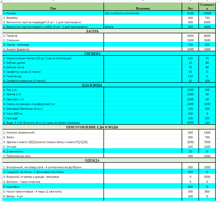 Рюкзак попроще. Баллоны от педведей нахуй (выше объяснили) Баллон от людей оставь 1. Палатка и спальник попроще (выше объяснили) Тент 3х3 и масса будет грамм 500. Мыло 1 брусок хозяйки за глаза. ЖРАТ нужно МОАР блиать! И специи и чайное ассорти прихвати. Мяса насуши или хоть колбаски захвати. Мука обязательно. Сахар обязательно. Флягу оставь, зело годно готовить жрат и греть чай одновременно. Поплавок может и не прокормить, а вот экраны и ловушки из сетки эффективнее, так что и их прихвати, они нихуя не весят. Огниво нахуй. Осваивай лучок или не еби голову и купи ещё одну крикетку. Футболок 2. 1 толстовки хватит. И добавь хб термобелье. Ботинки одни. На носках разоришься, бери хб. Трусов 2 шт хватит. Одежу для стоянки нахуй. Штаны одни, просто собери рем. комплект. (иголки, нитки, пуговки, заплатки, клей, булавки, обувные нитки и шнурки) Термометр нахуй. Лейкопластырь только ленточный. Вата. Жгут. Лезвие бритвы или скальпель одноразовый. Кетанов добавь. Мультик без пассатижей говно и нахуй. Пассы нужны прошивать тенты, обувь, снарягу и что бы достать рыболовный крючок из жопы или пальца. Пила именно ленточная, не перепутай со струнным говном. А ещё лучше возьми обычную небольшую. Карта бумажная блиать! Батарейки запасные если фонарь не какумуляторный. Фонарь кемпинговый, малый, рассеяного света. Собери спартанский наз и научись им пользоваться. (одеялко из фольги, карта бумажка, мини компас, небольшой нож, минимум снастей, зажигалка, фольга, моток капроновых ниток, и прочая лабуда) пиздуй на ютуб и много смотри и ещё больше думай.