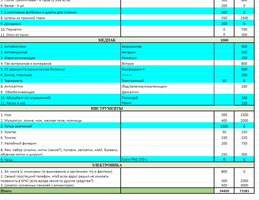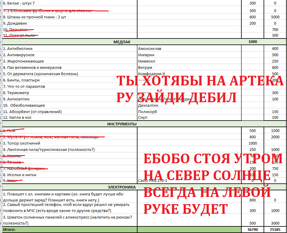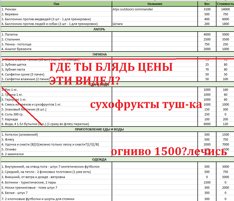 CОБИРАЕМ АНОНА В ЛЕС ВСЕМ ДВАЧОМ Этим летом хочу отправиться в одиночный поход по России куда глаза глядят. Сдохну и похуй. Поход будет состоять из 2 повторяющихся этапов: 1. Куда-то иду 2. Делаю стоянки, если место понравилось. Повторить n раз пока не сдохну или не заебет. Примерно составил список всего эквипа, который надо купить, но вышло черезчур дорого и тяжело. Прошу помощи анона для удаления из списка ненужных вещей и рекомендаций по поводу конкретных моделей эквипа.