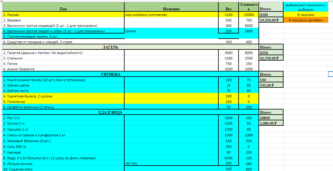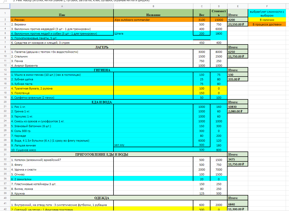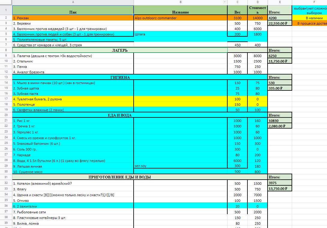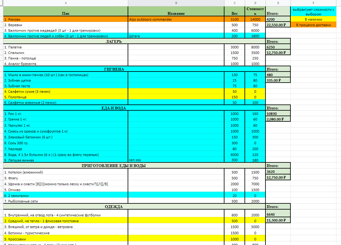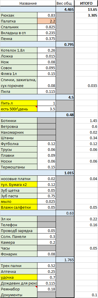 >>90083 палатку не стал менять на 1.5кг одноместку, т.к. пока не успел купить ОООП, а без него побаиваюсь показывать, что я один. желтым все, что докупить.