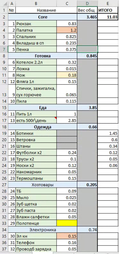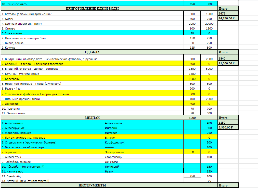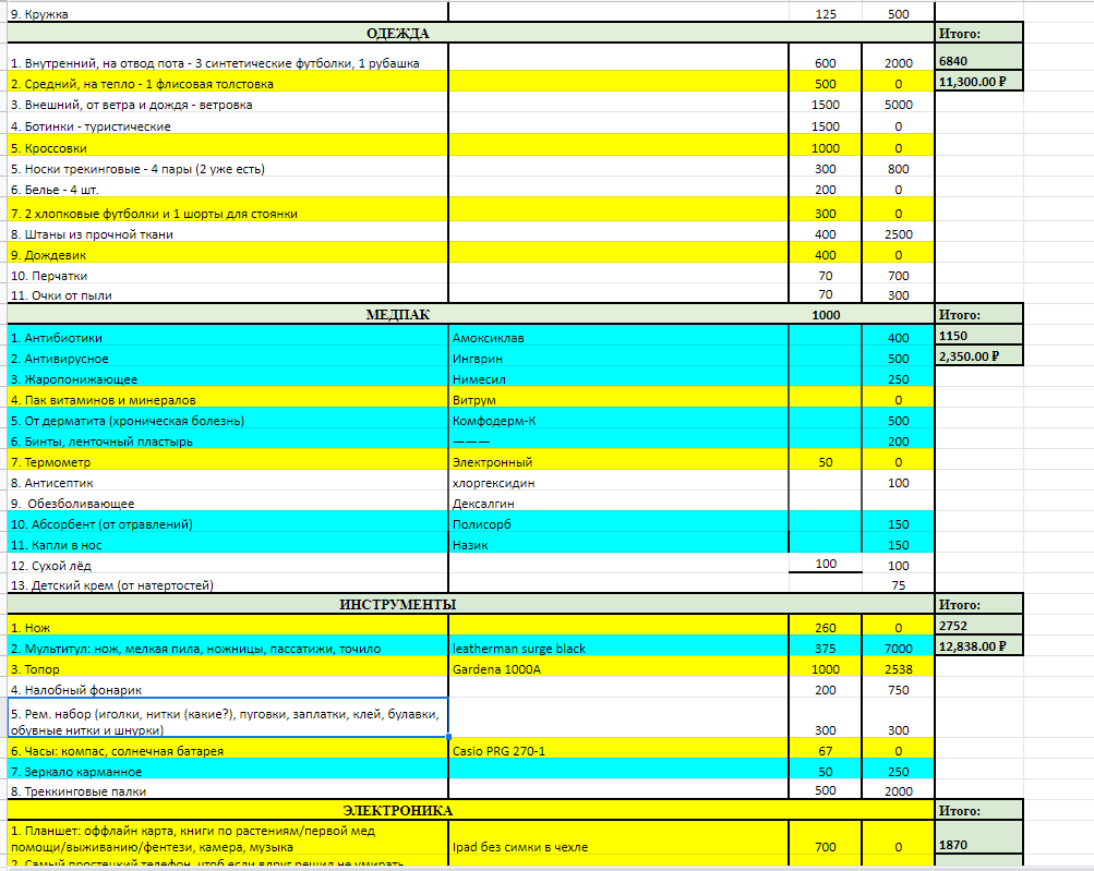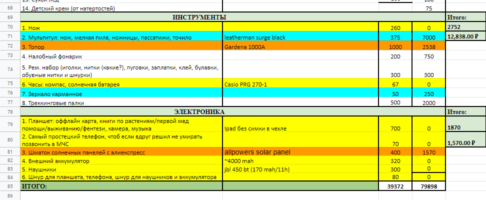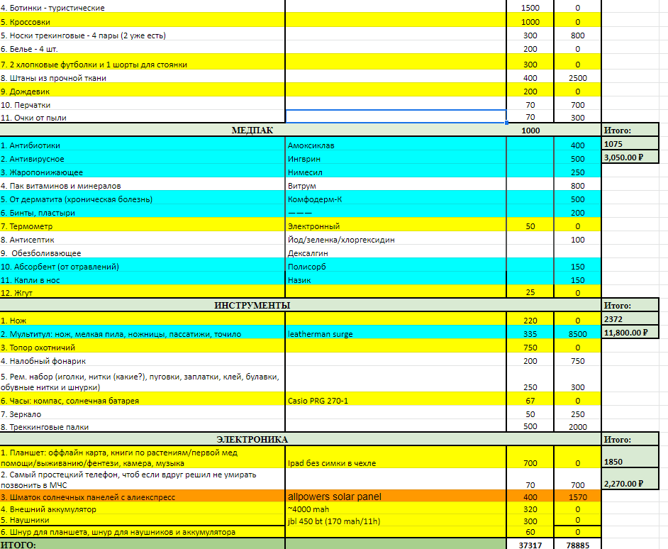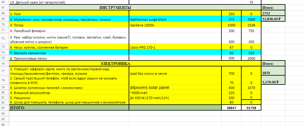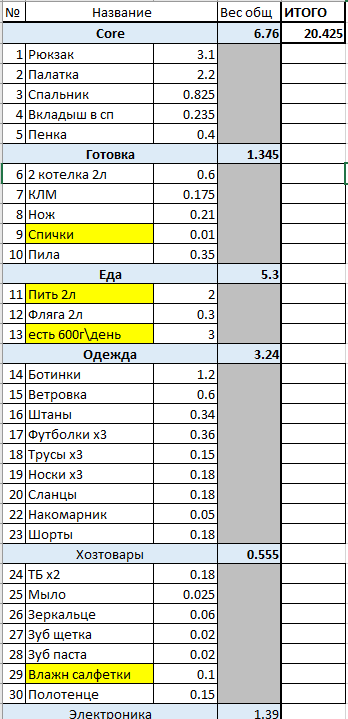 >>90083 палатку не стал менять на 1.5кг одноместку, т.к. пока не успел купить ОООП, а без него побаиваюсь показывать, что я один. желтым все, что докупить.