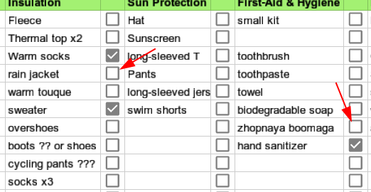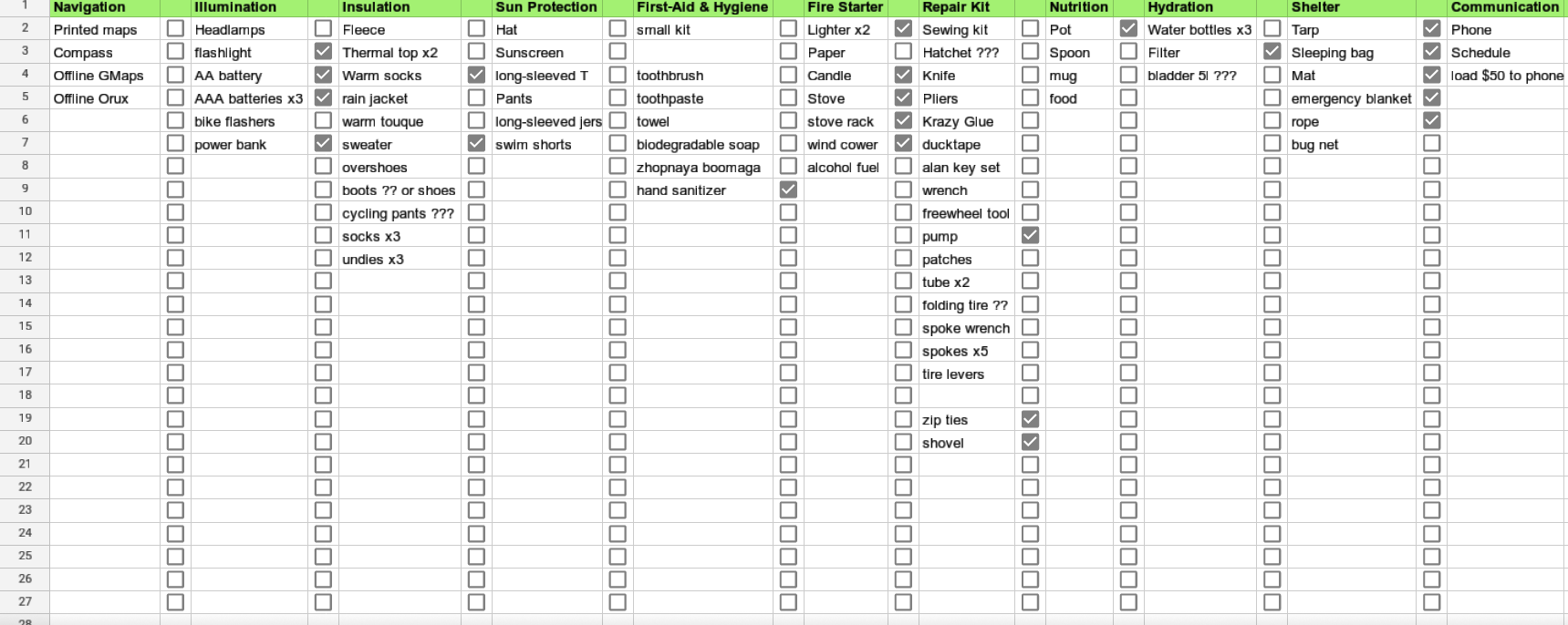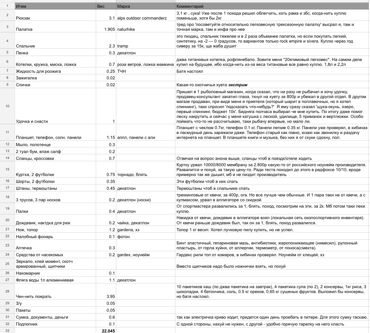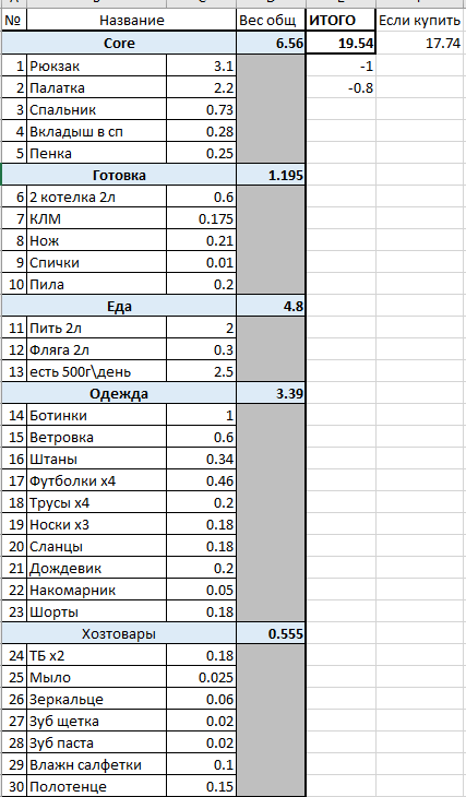 >>61987 (OP) Я уже проебал больше 1к$ на снарягу Планирую на ноябрьские праздники на пару дней съебаться куда-нить в подмосковье Наконец-то собрал нормальный список того, что брать в средний в вакууме недельный поход, возьму из него, но меньше жрачки/одежды + павербанку вместо панелей