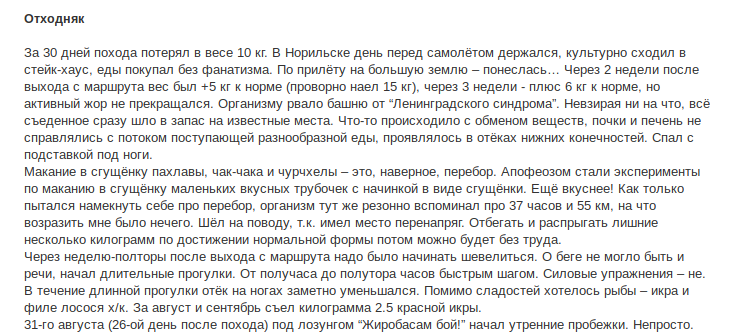 >>86254 >не беру горелку так как не отказываюсь от идеи многомесячного похода в шапке. А в таком походе газа не напасешься. Потому тренируюсь без горелки оптимизировать раскладку и жрать холодную кашу с подножным кормом Взять газ будет абсолютно разумно независимо от продолжительности. Хотя бы для подстраховки плохих сырых дней, а в хорошие сухие можно использовать костер. Не сопротивляйся очевидному, бери газ, один баллон и котелок, который не жалко поставить и на костер. Будет возможность - будешь тренировать костер, не будет возможности - будешь все равно с комфортом ужинать горячим и пить чай. Небольшое увеличение веса того стоит. Если же думать прямо про многомесячный и вообще большой поход, то они ходятся как правило с забросками. Ты заранее должен или прикопать где-нибудь по пути запасы, или например отправить их по почте себе до востребования в поселок на пути, и тогда вопрос с газом тоже решается независимо от продолжительности путешествия. Посмотри на пример Чегодаева - прошел этим летом 3000 км по Уралу в одиночку, при этом готовил на газу. Сносил кстати за поход шесть пар кроссовок. Если мечтаешь о гигантских расстояниях подумай и про этот фактор, ресурс обуви и одежды не вечный.