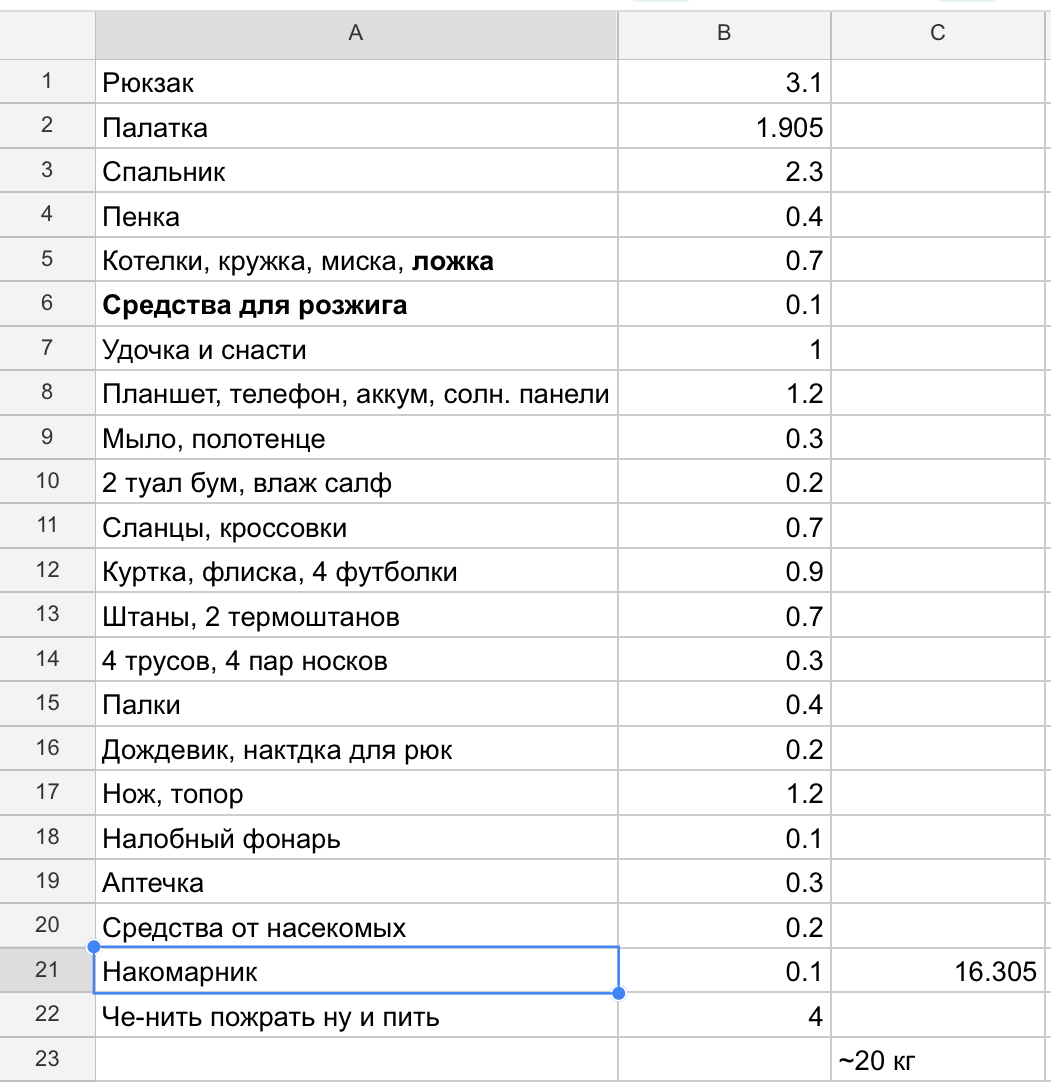 Что не увидел в списке - шлепки/кроксы для стоянки и бродов, одежду для сна (хотя есть вкладыш в спальник, ок), крем от солнца, солнцезащитные очки