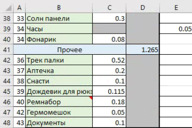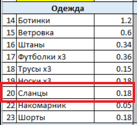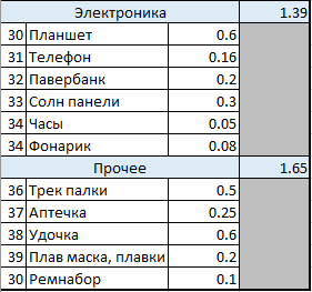 Рюк 1.1, внешний слой палатки 0.6 + пенка 0.4, спальник 0.9, еда ~4, вода 1, газ 0.3 посуда 0.4, пила 0.3 одежда включая мешок хранения и пончо в пределах 1, мешок всякой мелочевки с аптечкой ремнабором, компасом картой спичками примерно 1, повербанк и фонарик примерно 0.5-0.7