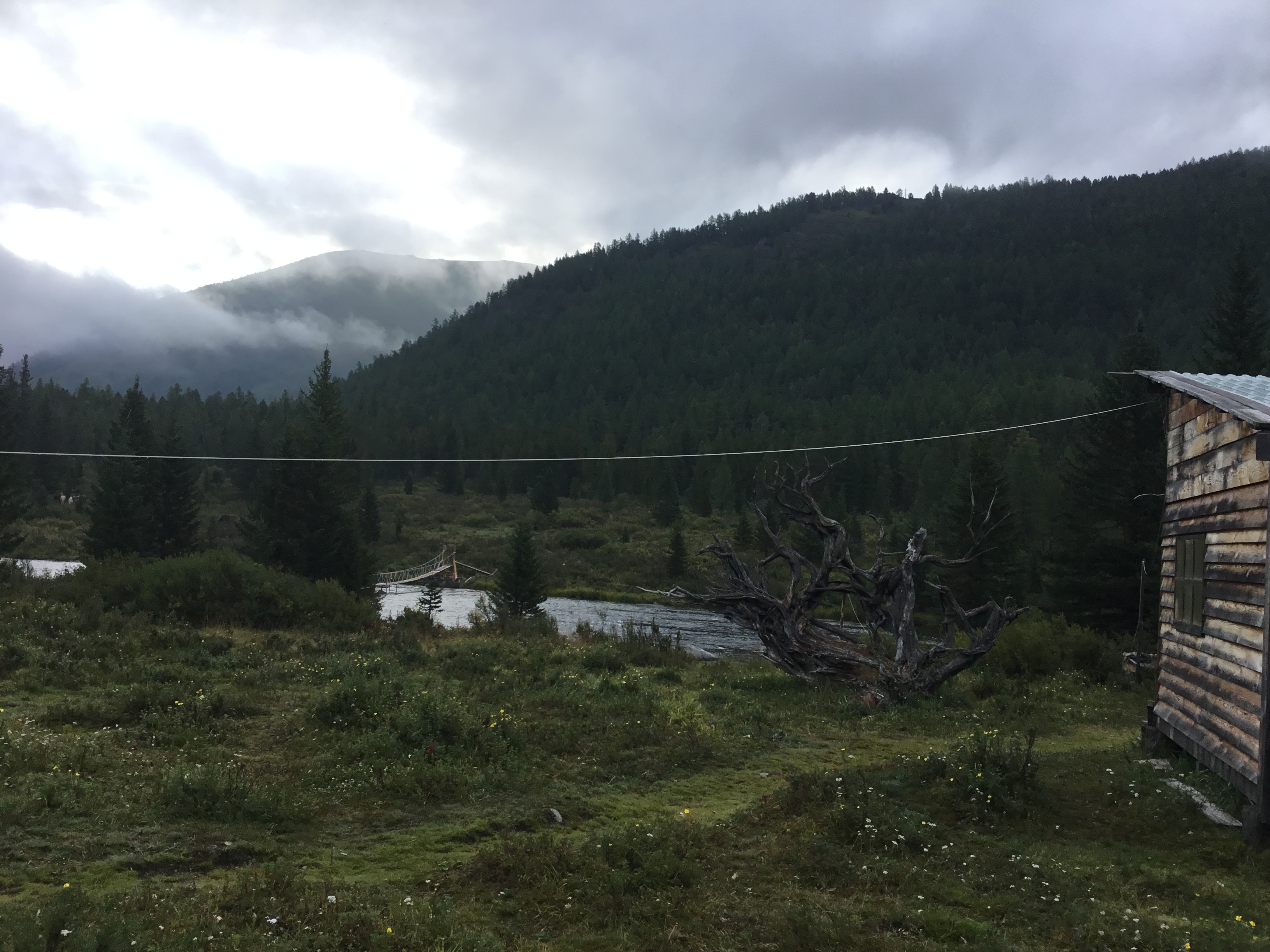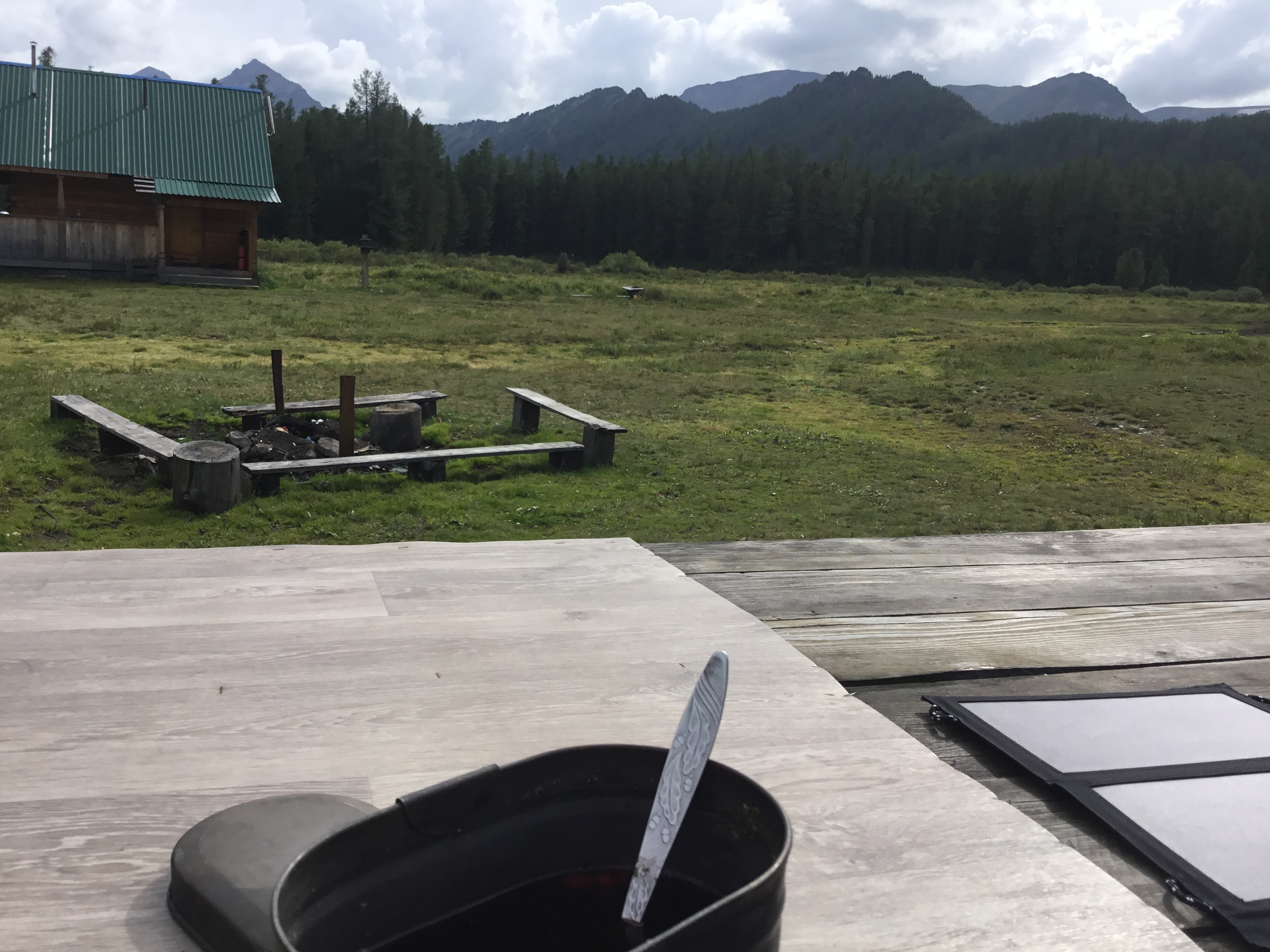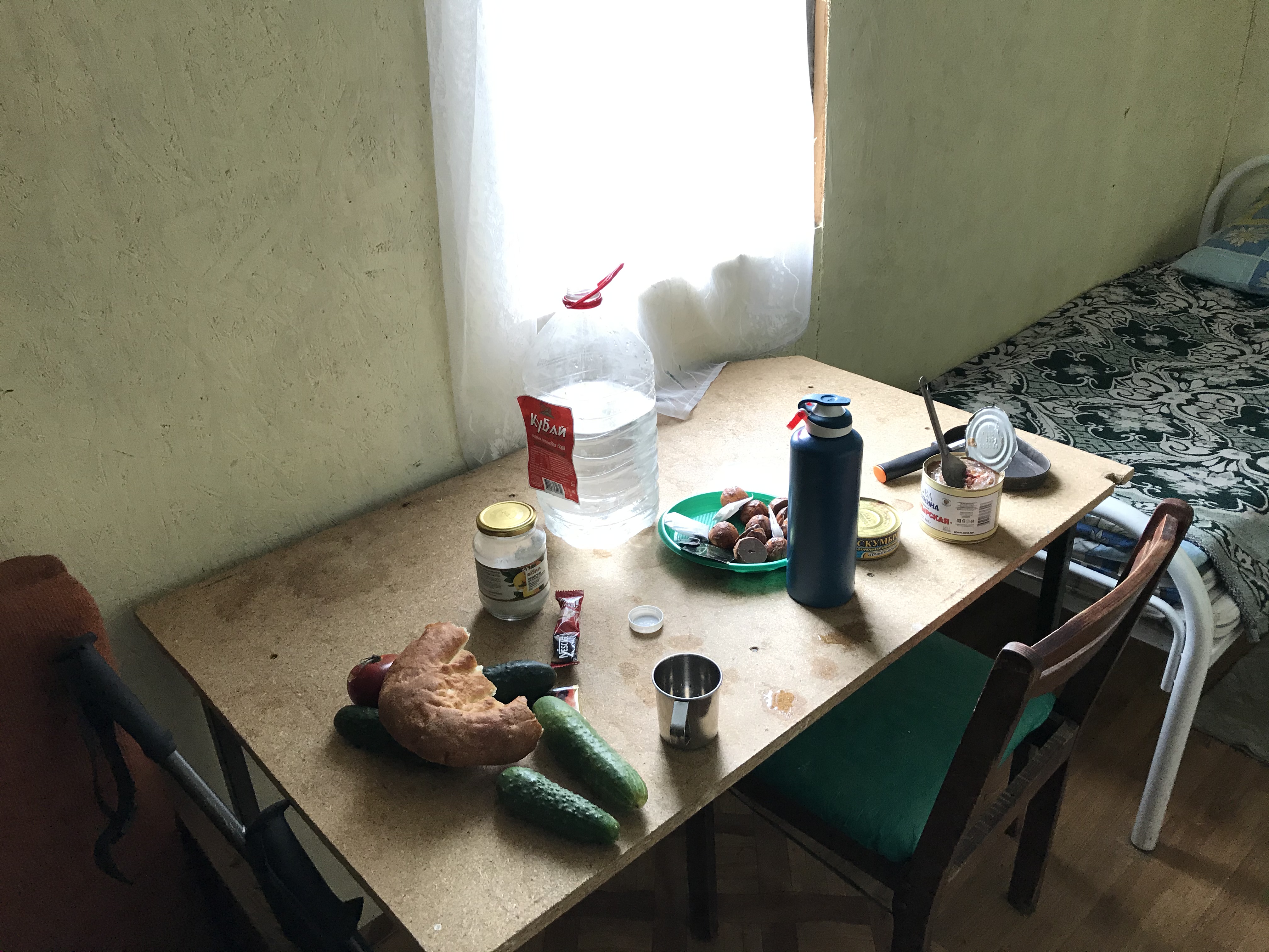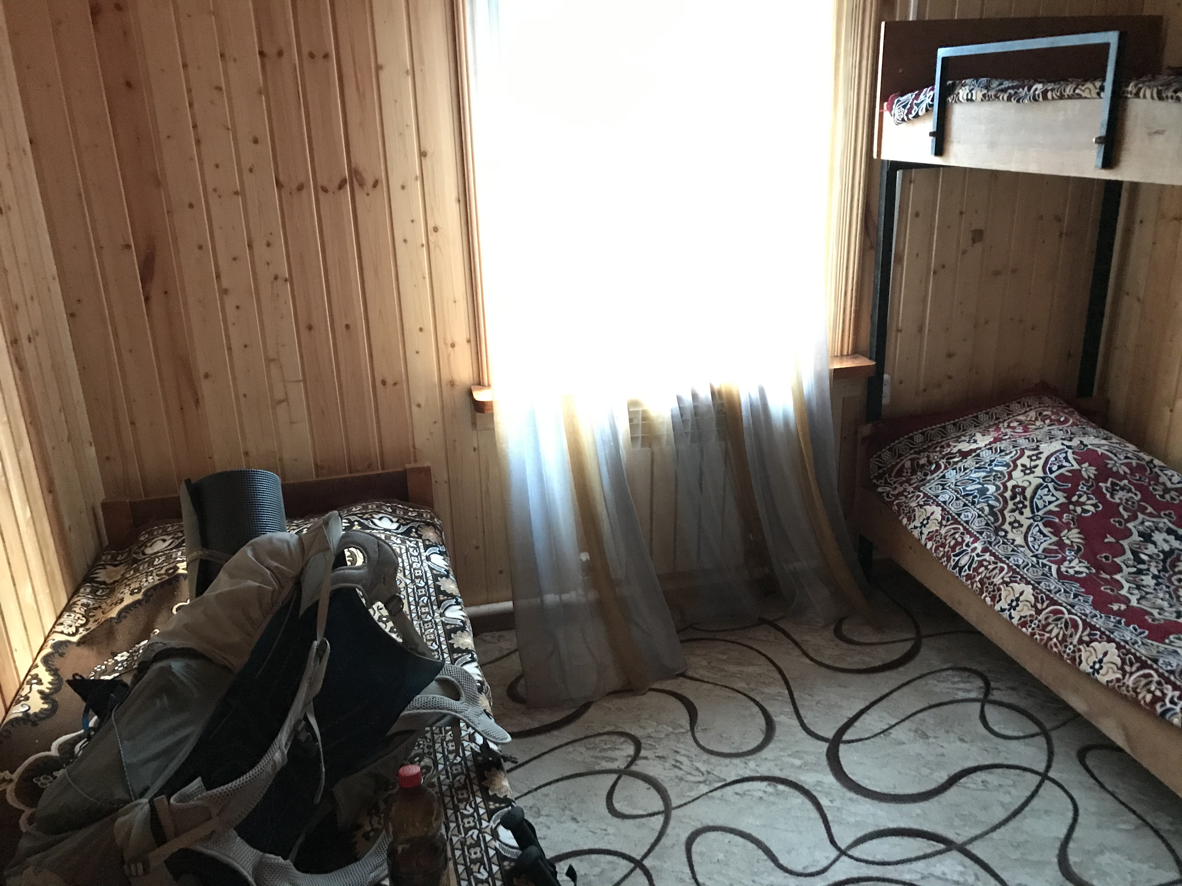 День 4. Самый легкий, спуск 9 км. Специально планировал день легким, перед последующим перевалом Муху. Добрался до турбазы, за 300 р дали номер (видрил 1), но у меня только тысяча была. Дед подумал и, узнав, что я жрать хочу, натаскал еще едв на 300-400р. (пик 2). Все равно дороговато вышло, но хуй с ним.