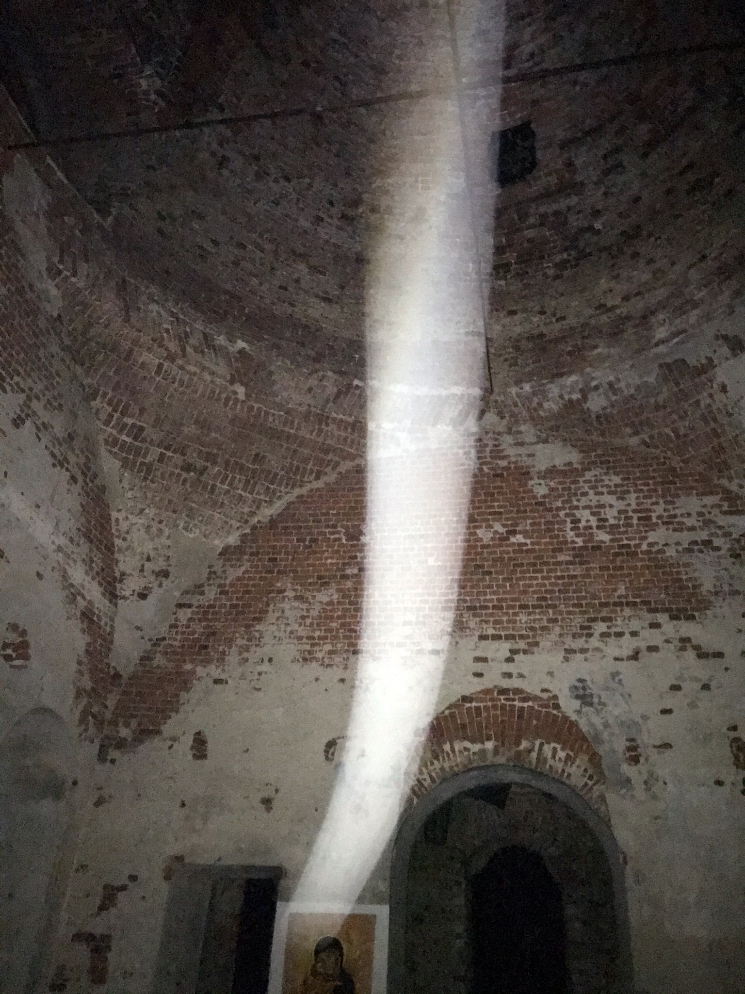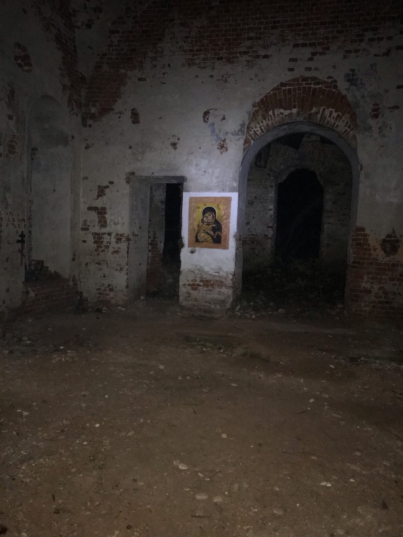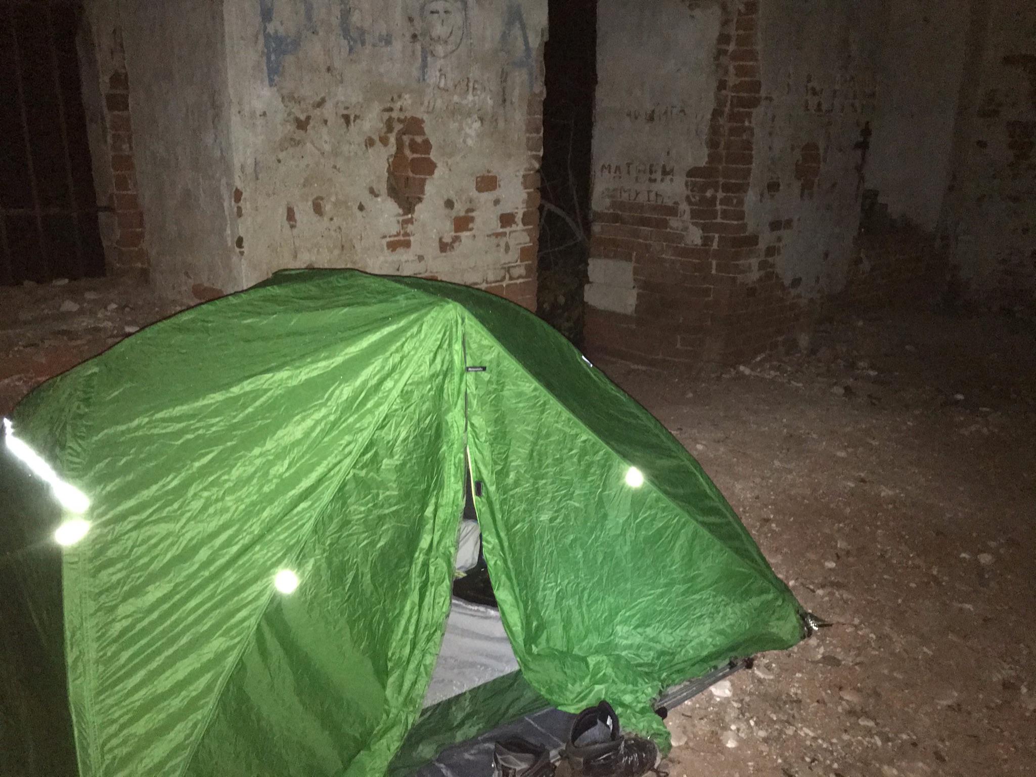 >>86247 Дошел до церкви, поставил палатку, которую то и дело сдувало без колышков (так как в бетон церкви колышки не вбить), и сел час отогревал ноги в спальнике. Затем в качестве извинений зажег церковную свечу, которую я заранее притащил из церкви рядом с моим домом, перед единственным сохранившимся рисунком, после чего поел каши с мясом неразогретой (после прошлого дождливого похода переосмыслил раскладку и в этот раз с собой взял только треть еды, для приготовления которой необходим костер) и лег спать на 13 часов (перед походом нихуя не смог заснуть, так что к тому моменту не спал уже часов 30). Несмотря на сильный ветер и отсутствие колышков, палатка держалась молодцом и не развалилась. Еше на 4пике какой-то странный засвет вышел, хз почему, хотя когда фоткал такого света там не было. Из источников света была только вспышка в телефоне и фонарь на голове.