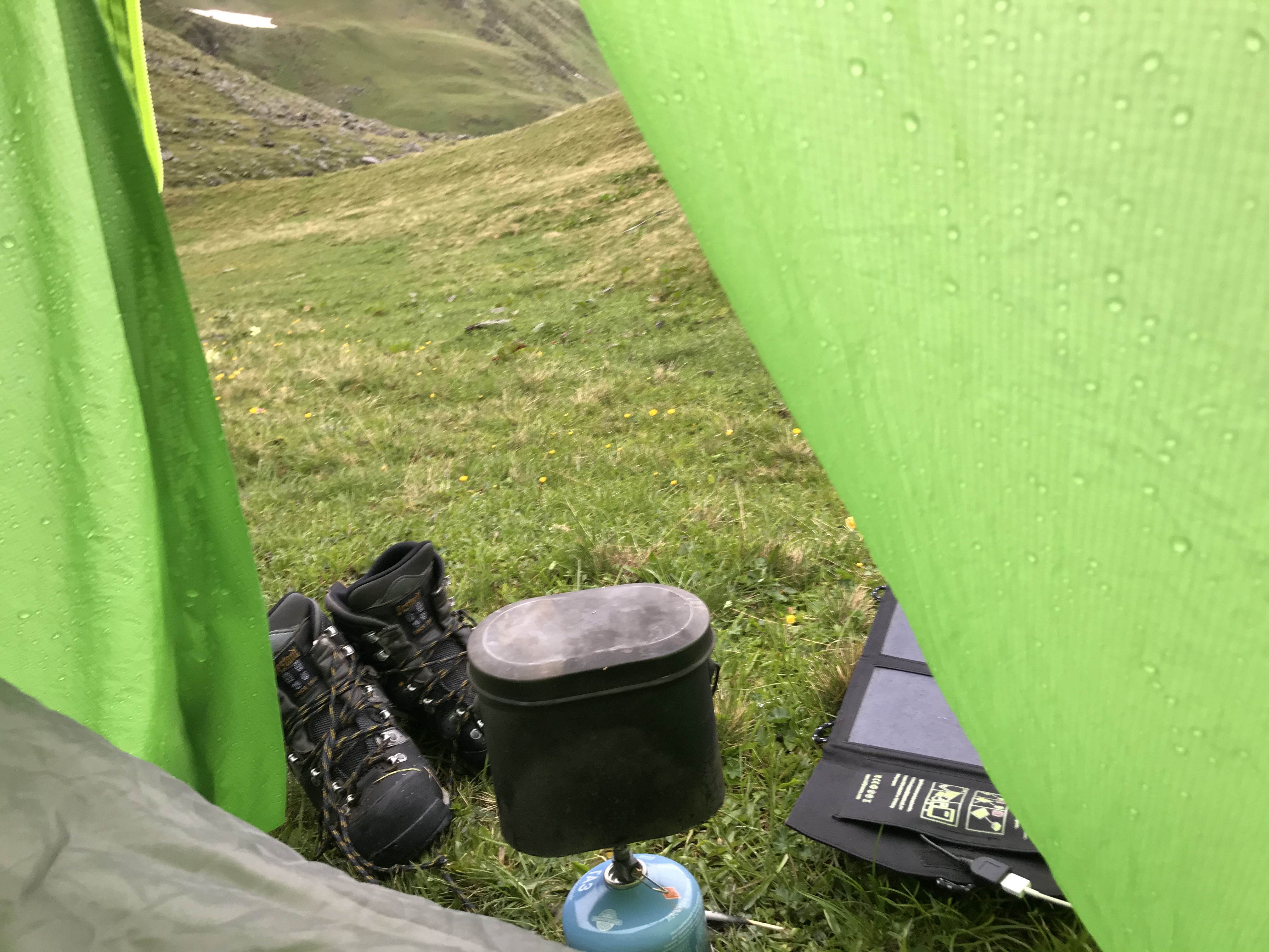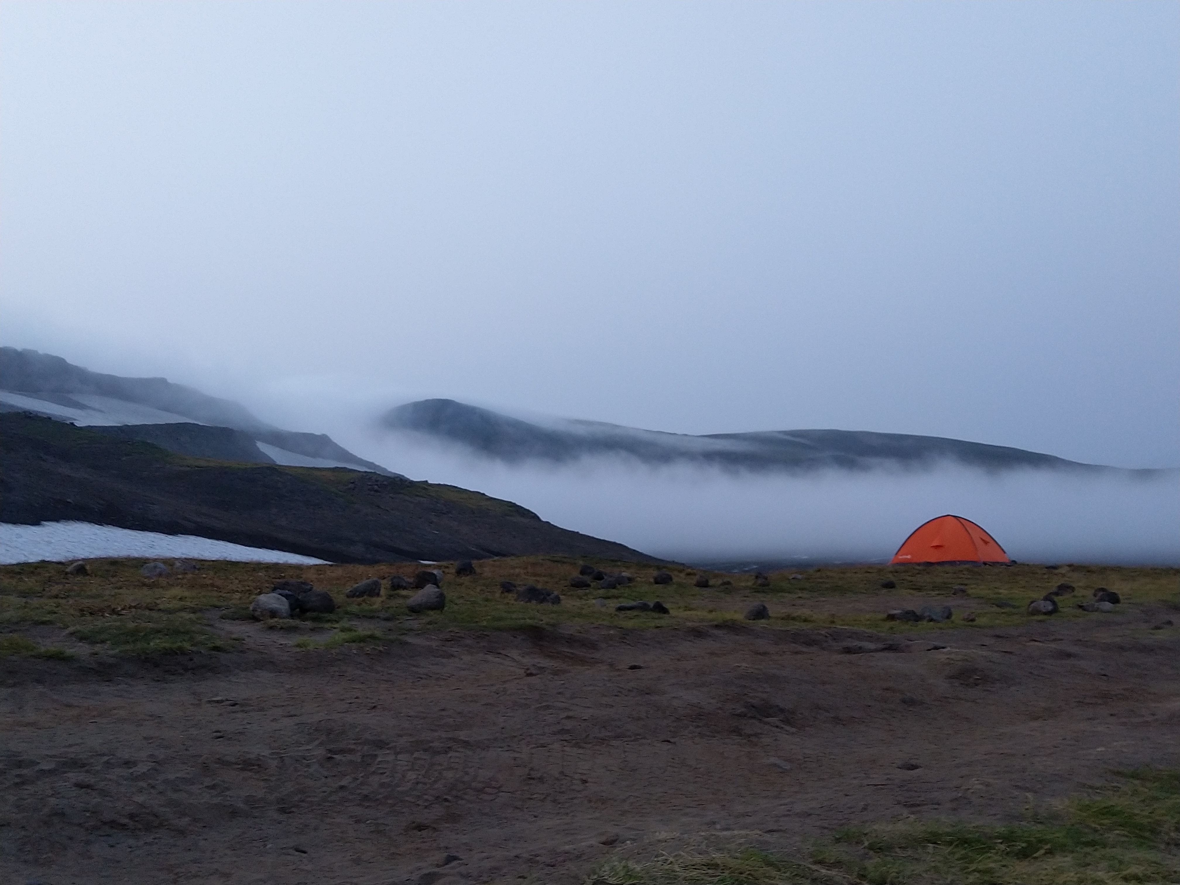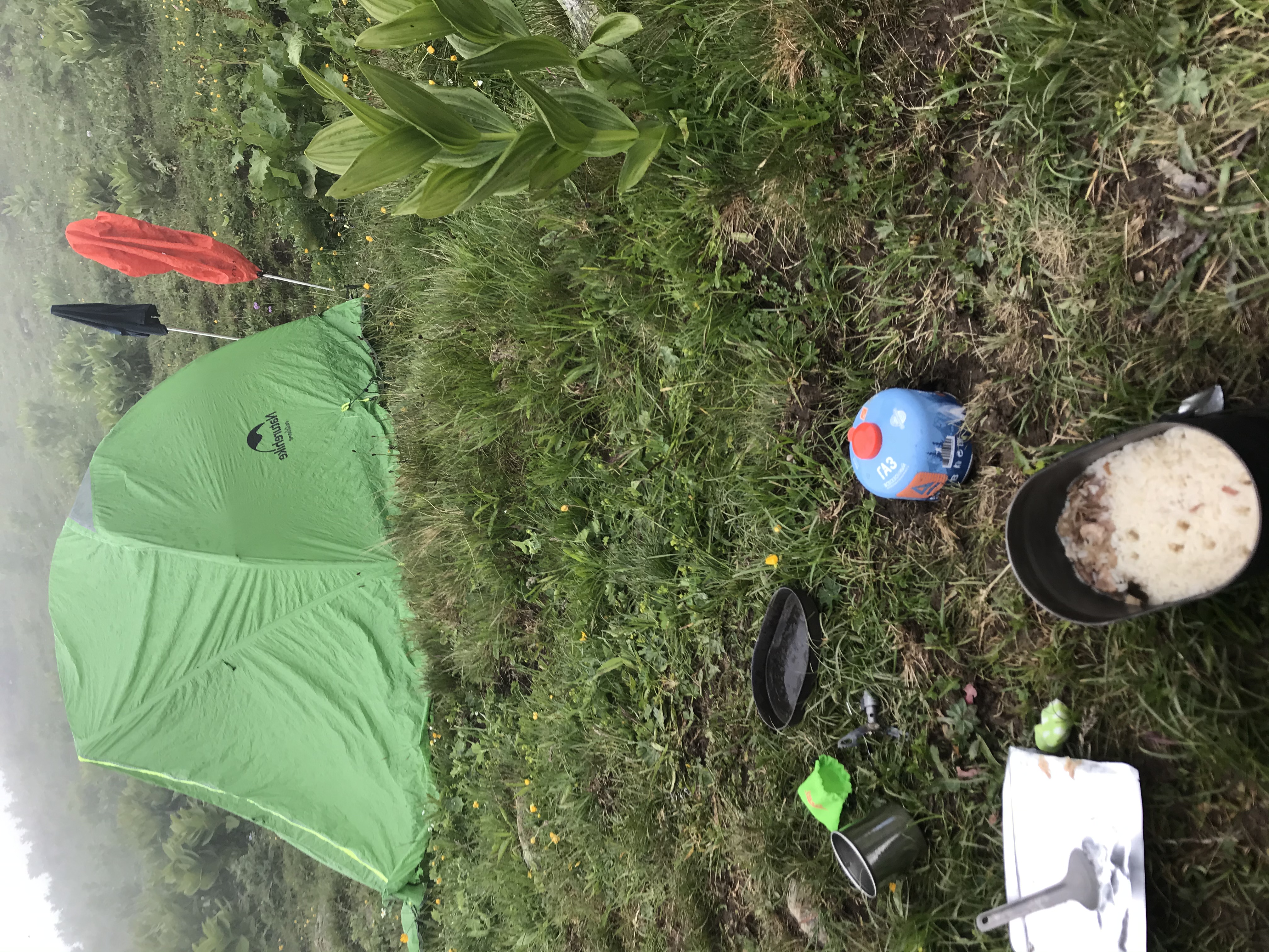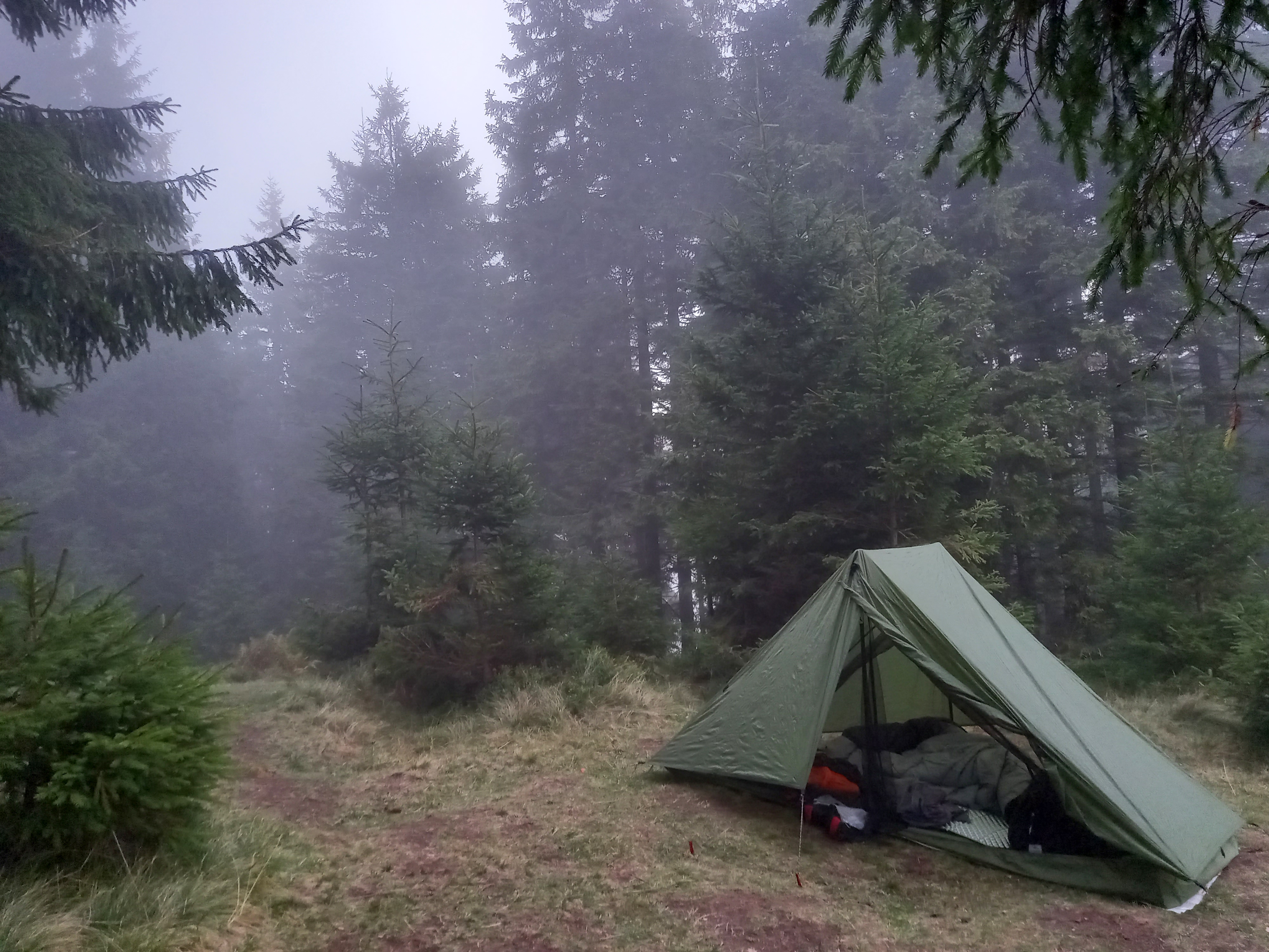>>91757 День 3. Средняя сложность, 10км, спускался километр с горы, и столько же лез на другую гору. Позавтракал кашей, выбросил остаток, собрался и пошел. По идее день должен был быть трудным, но на протяжении почти всего маршрута была нормальная дорога. Только когда почти спустился, меня навигатор снова наебал, и проложил мне путь в обрыв. Весь день шел дождь, во вторую половину ливень, всю дорогу размыло (пик 2) и мембрана просыхать не успевала. Дошел до «шикарного места под палатку» (видрил 1), часа 3 отогревался в спальнике. Заебало жрать орехи с шоколадом, думал о лагмане и пюрешке с каклетками. В итоге сварил себе чуть каши гречневой, поел, лег спать. Попытался варить в тамбуре (пик 3), кстати, от дыма и запаха охотничьей спички охуел. Просыпаюсь в 2 ночи потому что из-за ебейшего ливня начало казаться, что палатку заваливает. Забил хуй, сплю дальше. Не завалило.