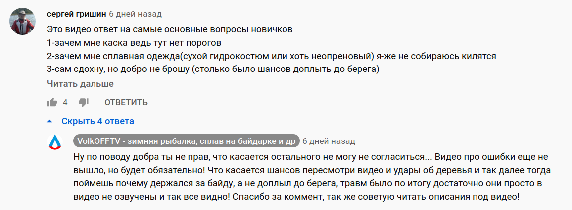 >1-максимально сохранял снарягу и лодку Это вообще самое важное Самое важное - его жизнь и здоровье, которыми он неоправданно рисковал. Если у него еще и ребенок маленький, то оставил бы жену с голым задом. >у него до пиздеца и близко не было, ТАм на видео еще одна байдарка перевернулась.