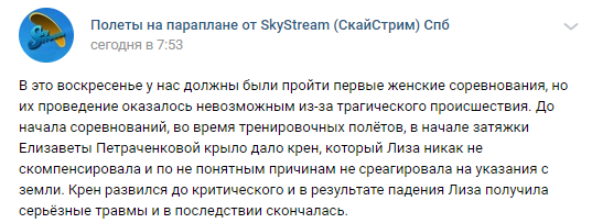 Вот инфа в группе подъехала. Невыправленный крен на старте и пиздарики. Алсо респект Скайстриму что не побоялись об этом публично рассказать. Помню, когда в САС ученик на выезде убился, они просто закрыли тему и в группе ничего про это не написали - ведь так же можно отпугнуть поток покатушечников, несущих бабло, и порушить бизнес.