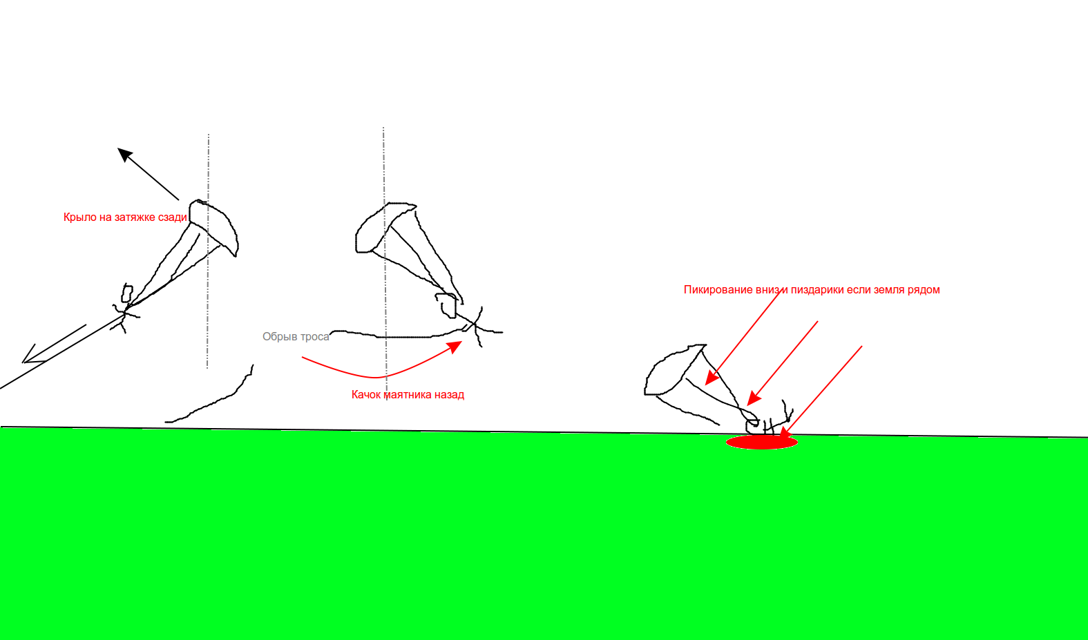 Если в нормальном полете пилот висит под крылом, то при затяжке (так как трос крепится к пилоту) пилот спереди, а крыло сзади за ним под углом. Если трос рвется и тяга пропадает - получается как будто маятник, отклоненный вбок. Происходит сперва качок пилота-маятника назад относительно точки подвеса (крыла), а затем пикирование вперед и вниз, происходящее с потерей высоты (метров 5-10 или больше) и набором большой скорости.