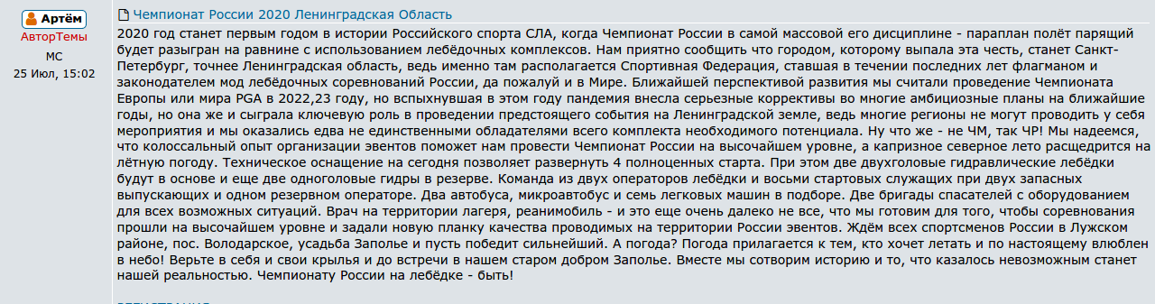 В Питере у нас опять какие-то скандалы-интриги-расследования, теперь похоже будут воевать две федерации - СПб и Ленобласти. Решили провести соревнования в один и тот же день - ЛО их изначально на эти даты планировала, а СПб перенесли из-за почти месячного запрета. В итоге теперь делят воздушное пространство, блокируя друг другу возможность летать. Пиздос, вот же людям делать нечего, еще и сраться.
