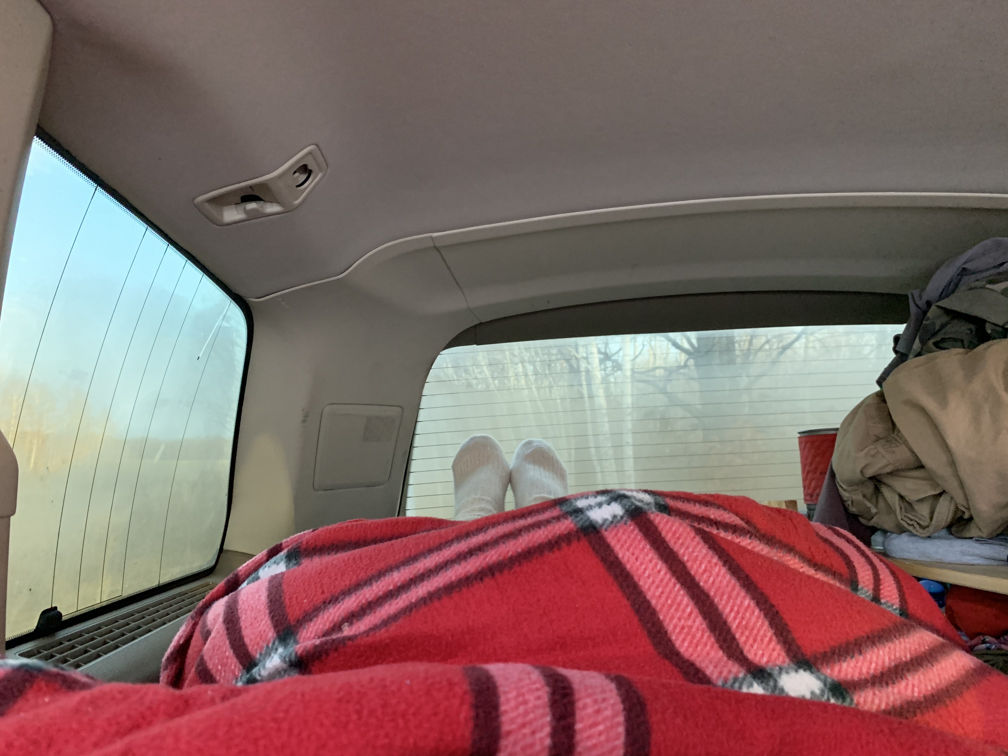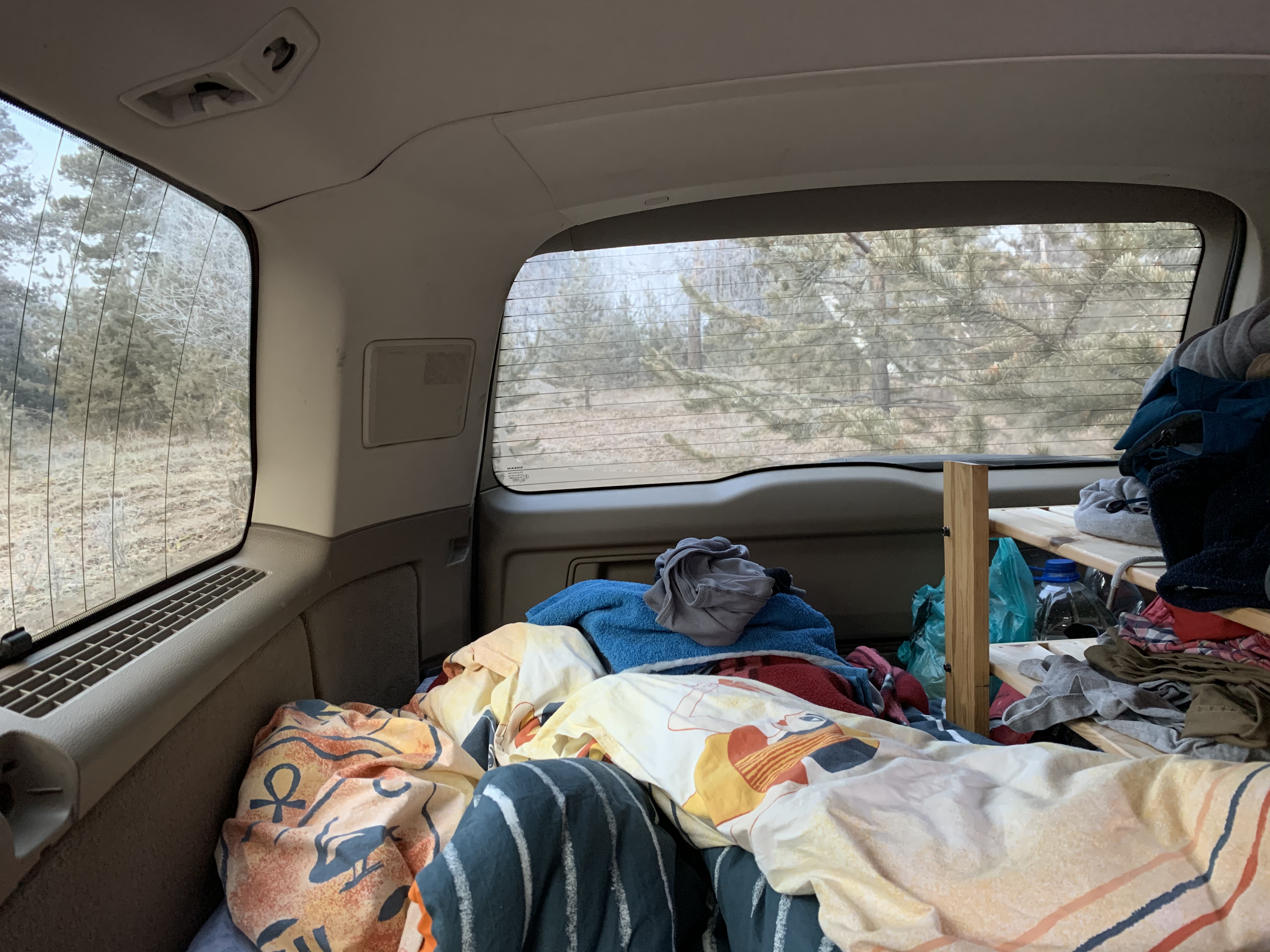 На улице март 2020, дождь, я лежу в бардаке салона, правый бок подперт великом. Его иногда на кочках подкидывает и он сползает так, что занимает мою кровать. Поправлять его мне лень, да и шевелиться в целом не хочется.