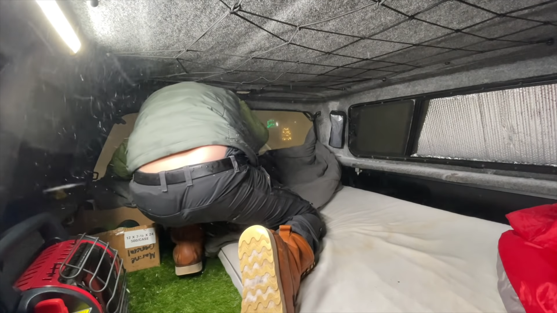 Наверно об этом все думали и никто не сделал. Потому что причины. Вот смотри, если ты такой минималист, почему бы не обойтись спальным мешокм? Причем тебе же не нужен гусиный пух, хватит просто нескольких очень теплых одеял. Со спальным мешком вообще ничего отапливать не надо будет. Если хочешь теплую спальню, почему не утеплить всю машину? Нормально тебе будет на пластмассовой доске спать и нюхать свой пердежь внутри? Оно еще и объема внутри кучу съест, может внутрь лучше печку поставить или что то такое.