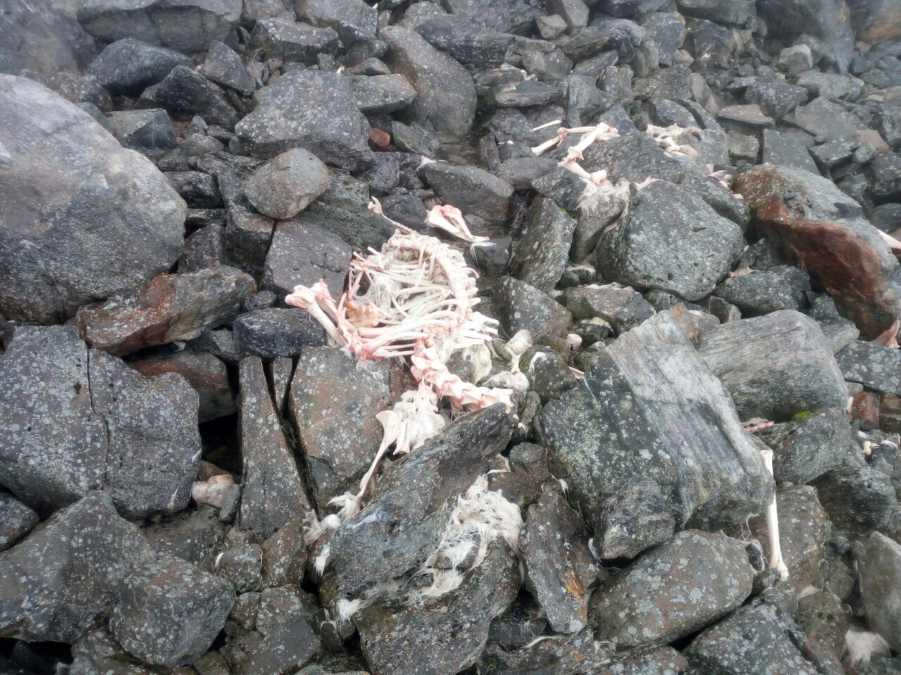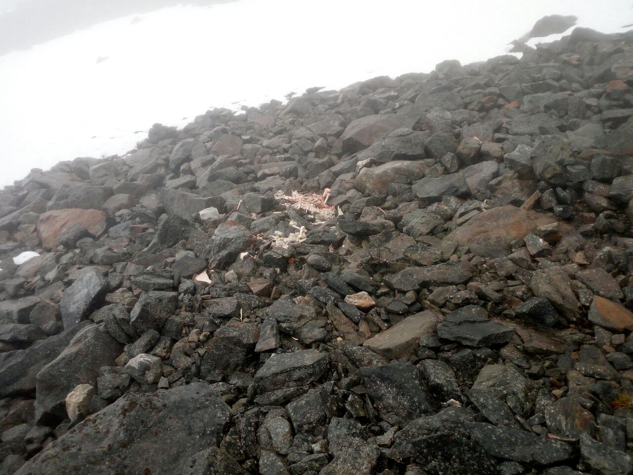 Напишу подробнее с картинками потом, сейчас совсем коротко. Перевалил вчера через тот хребет возле Тарфалы. В долине с той стороны оказалось дохуище мокрого вязкого снега, свежих человеческих следов нет вообще. Тропинка там сама по себе не очень (обозначена только редкими кучками из камней), а из-за широких насыпей снега её вообще хрен найдёшь. Ещё одна вещь: когда я пришёл в ту долину, меня ебанул туман и дождь. Из-за тумана порой не было видно хребтов по бокам долины, без GPS я бы там кончился. По снегу были какие-то тропинки, но большинство из них оленьи. Ещё нашёл довольно свежую расчленёнку — смотри пику — там ещё кровь на костях видна, то есть это в течение последних недель сделали. Подозреваю, что медведь нашёл дохлого оленя и сожрал.