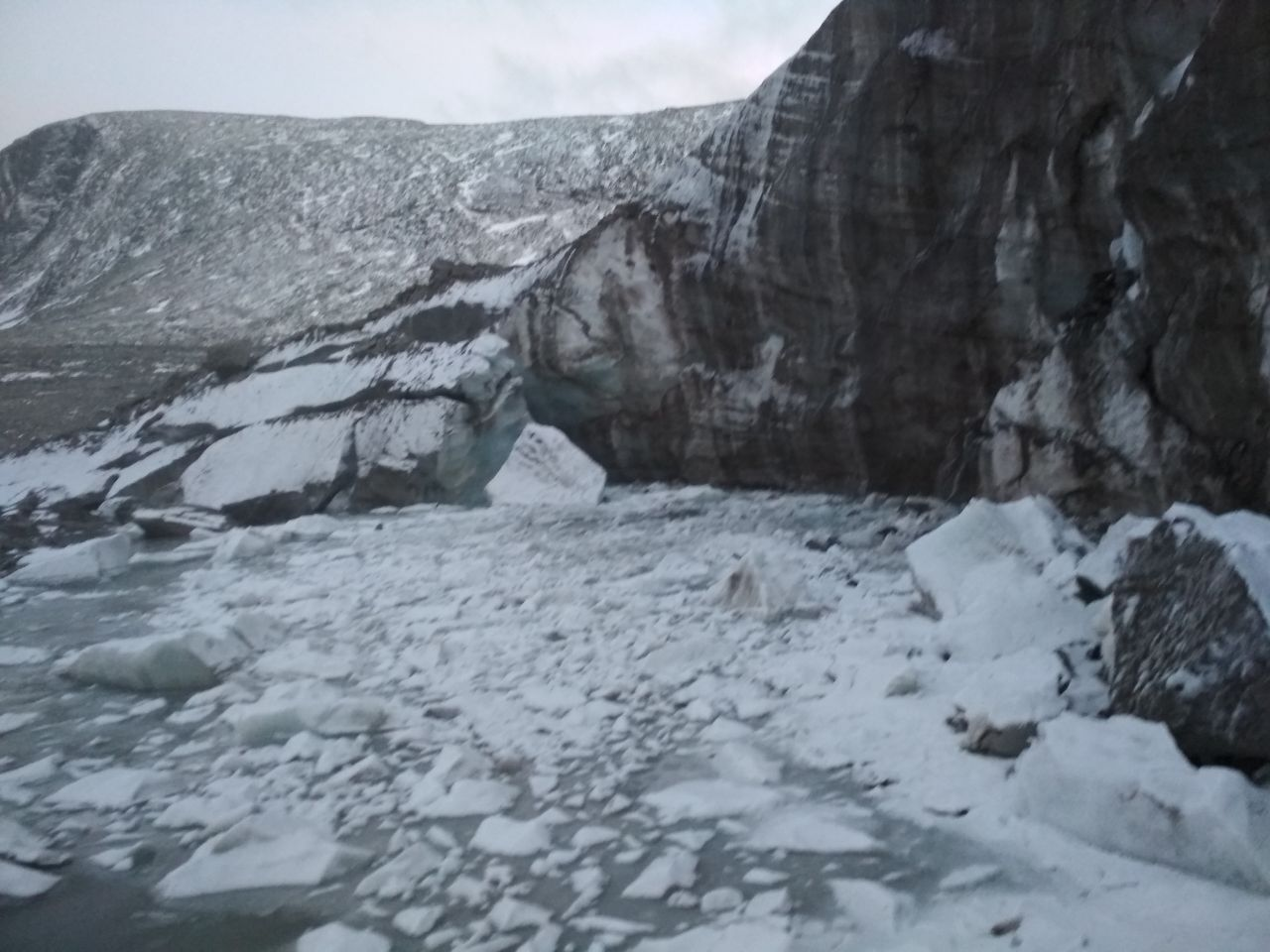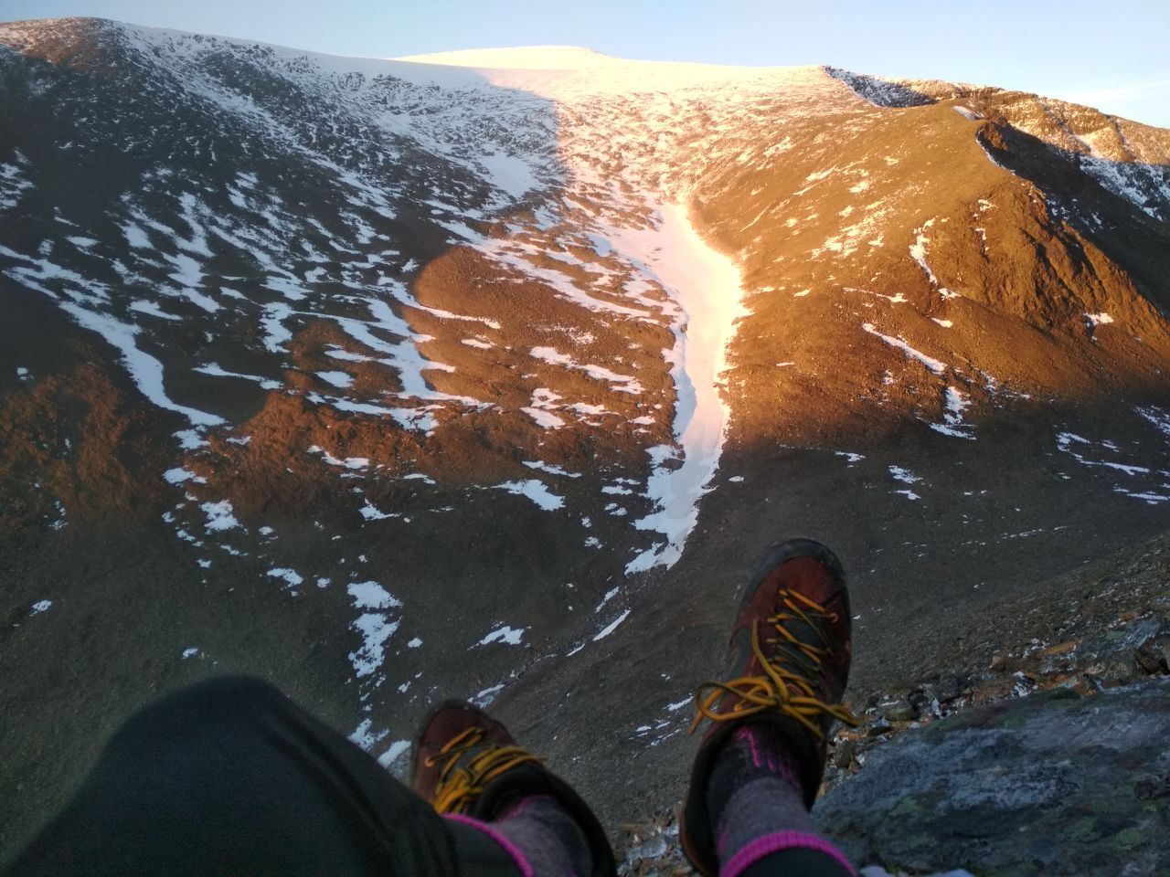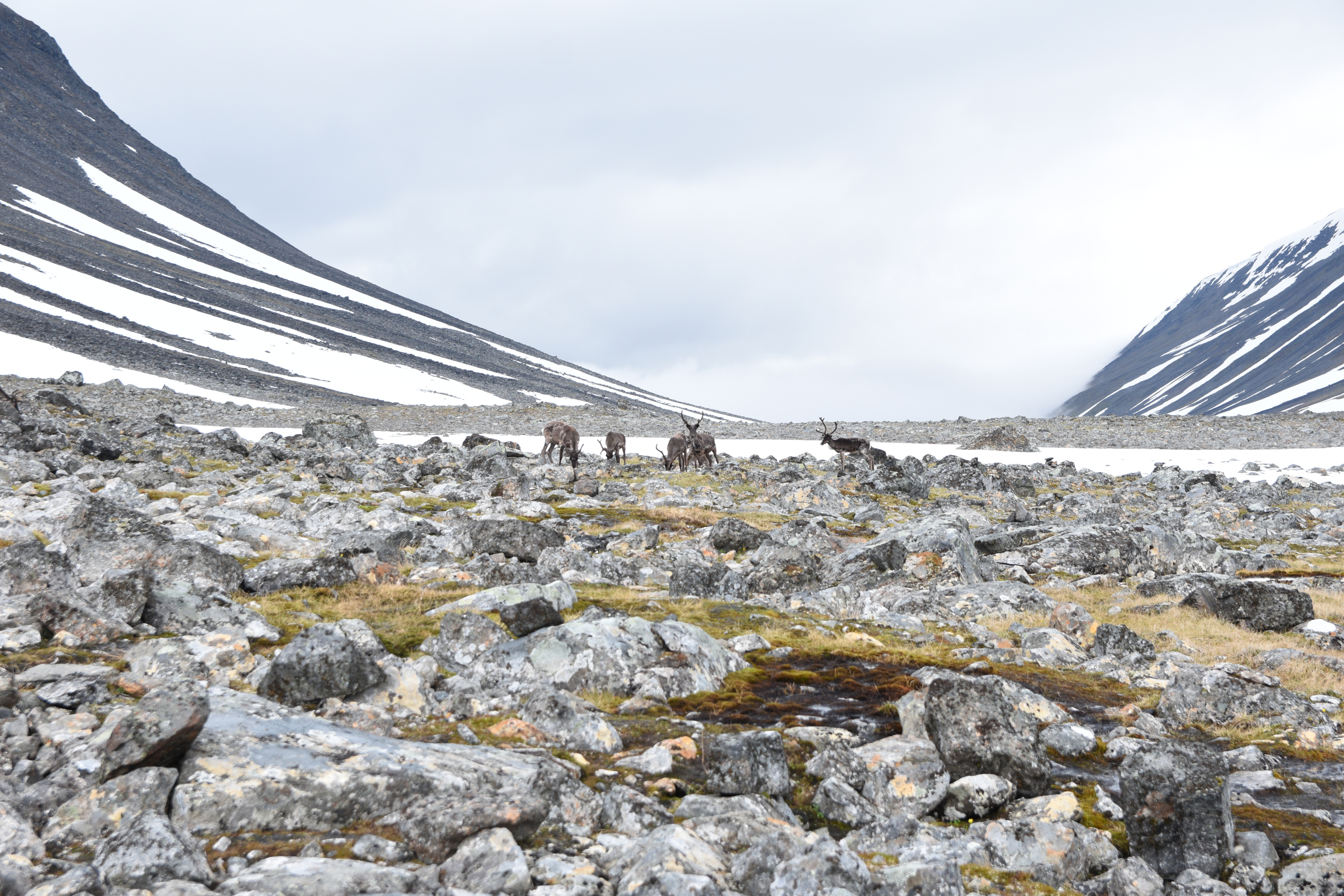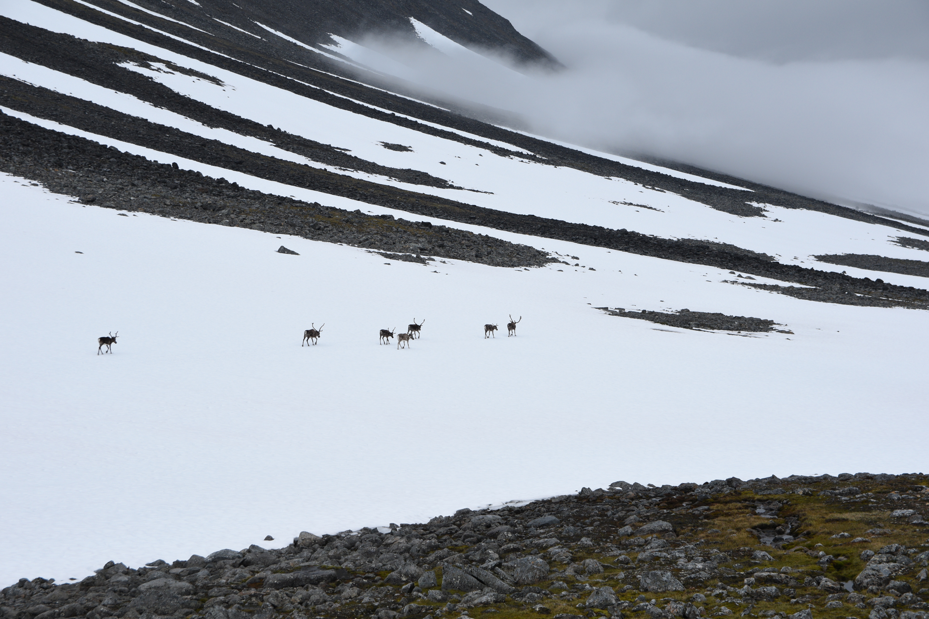 > Как вообще шлось? как настроение? До Тарфалы всё было отлично. Подъём после Тарфалы под дождём был как тренировка в сауне — потно, но ничего дикого. Когда решал, куда дальше идти, было стрессово, особенно стоя рядом с трупом. Потом, когда спускался по ущелью, бывало тоскливо от того, что людей в довольно большом радиусе нет, и что меня там могут не найти в случае чего. Потом мне составило компанию стадо оленей. Они были ниже меня и каждый раз, когда я приближался, они перебегали чуть ниже по тропинке. Кстати, они там вдоль и поперёк наследили по снегу, поэтому проходящую там старую человеческую тропинку было трудно искать (вблизи её можно узнать по дыркам от трекинговых палок). Были неприятные моменты, когда шёл по снежным склонам — некоторые из этих сугробов подмывались снизу ручьями, как бы не провалиться. Но всё было нормально, проваливался пару раз и только у краёв, где начинаются камни.